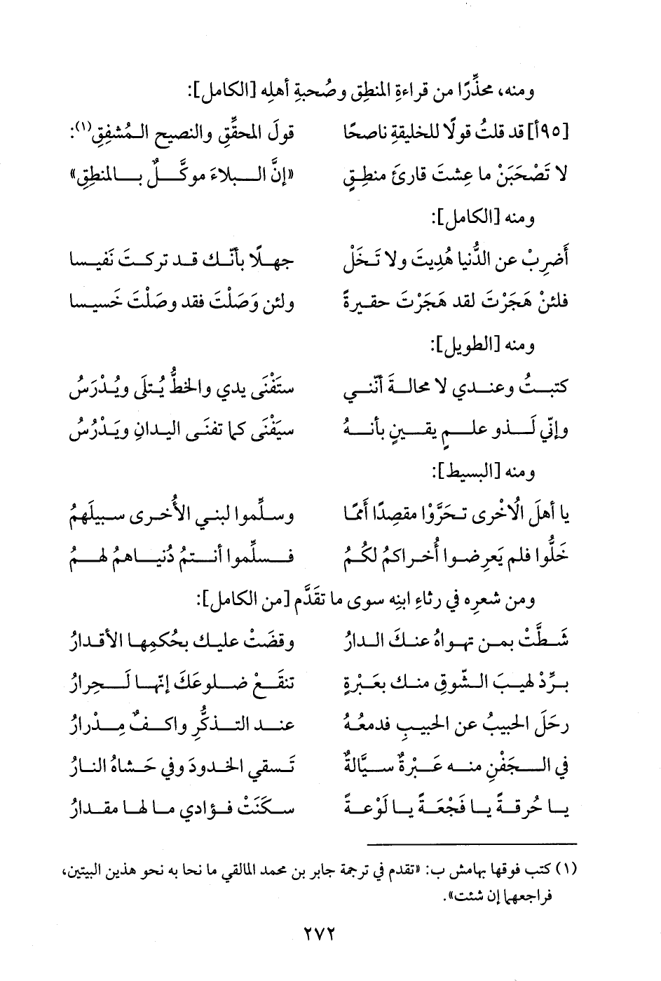 ومنه، محذِّرًا من قراءةِ المنطِق وصُحبةِ أهلِه [الكامل]: