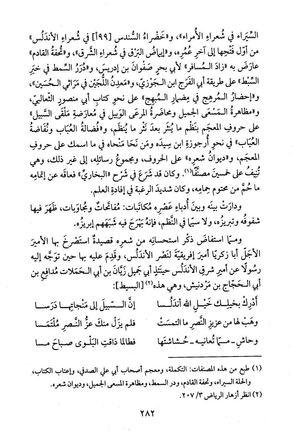 السِّيَراء في شُعراءِ الأُمراء"، و"خَضْراءُ السُّندس في شُعراءِ الأندَلُس" من أوّل فَتْحِها إلى آخرِ عُمُرِه، و"الماضُ البَرْق في شُعراءِ الشَّرق"، و"تُحفةُ القادم" عارَضَ به "زادَ المُسافر" لأبي بحرٍ صَفْوانَ بن إدريسَ، و"دُرَرُ السِّمط في خبَرِ السّبْط" على طريقة أبي الفَرَج ابن الجَوْزيّ، و"مَعدِنُ اللُّجَيْن في مَرَاثي الحُسَين"، و"إحضارُ المُرهِج في مِضمارِ المُبهِج" على نحوِ كتابِ أبي منصورٍ الثّعالبيّ، و"مظاهرةُ المَسْعَى الجميل ومحاضَرةُ المرعَى الوَبيل في مُعارَضةِ مَلْقَى السَّبيل" على حروفِ المعجَم بنَظْم ما يُنثَر بعدَ نَثْر ما يُنظَم، و"فُضالةُ العُبَاب ونُفَاضةُ العُيَاب" في نحوِ أُرجوزةِ ابن سِيدَه ومَن نَحَا مَنْحاه في ما اسمك على حروفِ المعجَم، و"ديوانُ شعرِه" على الحروف، ومجموعُ رسائلِه، إلى غير ذلك، وهي تُنِيفُ على خمسينَ مصنَّفًا (¬1). وكان قد شَرَعَ في شَرْح "البخاريِّ" فعاقَه عن إتمامِه ما حُمَّ من محتوم حِمامِه، وكان شديدَ الرغبة في إفادةِ العلم.