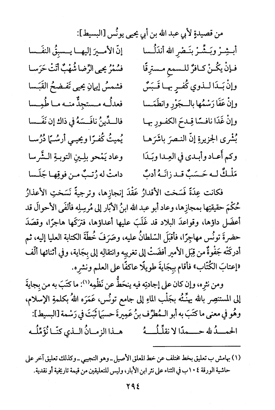 ومن نثرِه، وإن كان على إجادتِه فيه ينحَطُّ عن نَظْمِه (¬1): ما كتَبَ به من بِجايةَ إلى المستنصِر بالله يهنِّئُه بجَلْب الماءِ إلى جامع تونُس، عَمَرَه اللهُ بكلمةِ الإسلام، وهُو في معنى ما كتَبَ به أبو المُطرِّف بنُ عَمِيرةَ حسبَما ثَبَتَ في رَسْمة [البسيط]: