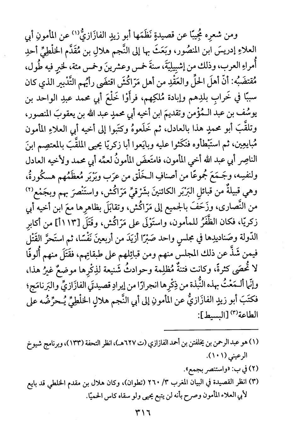 ومن شعرِه مُجِيبًا عن قصيدةٍ نَظَمَها أبو زيدٍ الفازَازيُّ (¬1) عن المأمونِ أبي العلاءِ إدريس ابن المنصُور، وبَعَثَ بها إلى النَّجم هلالِ بن مُقَدَّم الخلْطِيِّ أحدِ أُمراءِ العرب، وذلك من إشبِيلِتةَ، سنةَ خمس وعشرينَ وخمس مئة، لخبرٍ فيه طُول، مُقتضَبُه: أنّ أهلَ الحلِّ والعَقْدِ من أهل مَرّاكُشَ اقتضَى رأيُهم التَّدْبير الذي كان سببًا في خَرابِ بلدِهم وإبادة مُلكِهم، فرأَوْا خَلْعَ أبي محمد عبدِ الواحد بن يوسُف بن عبد المُؤْمن وتقديمَ ابن أخيه أبي محمدٍ عبد الله بن يعقوبَ المنصور، وتلقَّبَ أبو محمدٍ هذا بالعادل، ثم خَلَعوهُ وكتَبوا إلى أخيه أبي العلاءِ المأمون مُبايعِين، ثم استَبْطأوه فنكثوا عليه وبايَعوا أبا زكريّا يحيى الملقَّبَ بالمعتصِم ابنَ الناصِر أبي عبد الله أخي المأمون، فامتَعضَ المأمونُ لعمِّه أبي محمد ولأخيه العادل ولنفسِه، وجَمَعَ جُموعًا من أصنافِ الخَلْق من عرَب وبَرْبَر مُعظَمُهم هسكُورةُ، وهي قبيلةٌ من قبائلِ البَرْبَر الكائنينَ بشَرْقي مَرّاكُش، واستَنْصرَ بهم وبجَمْع (¬2) من النَّصارى، وزَحَفَ بالجميع إلى مَرّاكُش، وتقابَلَ بظاهرِها معَ ابن أخيه أبي زكريّا، فكان الظَّفَرُ للمأمون، واستَوْلَى على مَرّاكُش، وقَتَلَ من أكابرِ الدّولة وصَناديدِها في مجلسٍ واحد صَبْرًا أزَيدَ من أربعينَ نَفْسًا، ثم استَحرَّ القَتْل فيمن شَذَّ عن ذلك المجلس منهم ومن قبائِلهم على طبقاتِهم، فقَتَلَ منهم أُلوفًا لا تُحصىَ كثرةً، وكانت فتنةٌ مُظلِمة وحوادثُ شَنيعة لذِكْرِها موضعٌ غيرُ هذا، وإنّما ألمَعْتُ بهذه النُّبذة من ذِكْرِها انجرارًا من إيرادِ قصيدتَي الفازَازيِّ والبَرنامَج؛ فكتَبَ أبو زيدٍ الفازَازيُّ عن المأمونِ إلى أبي النَّجم هلالٍ الخلْطِيِّ يُحرِّضُه على الطاعة (¬3) [البسيط]: