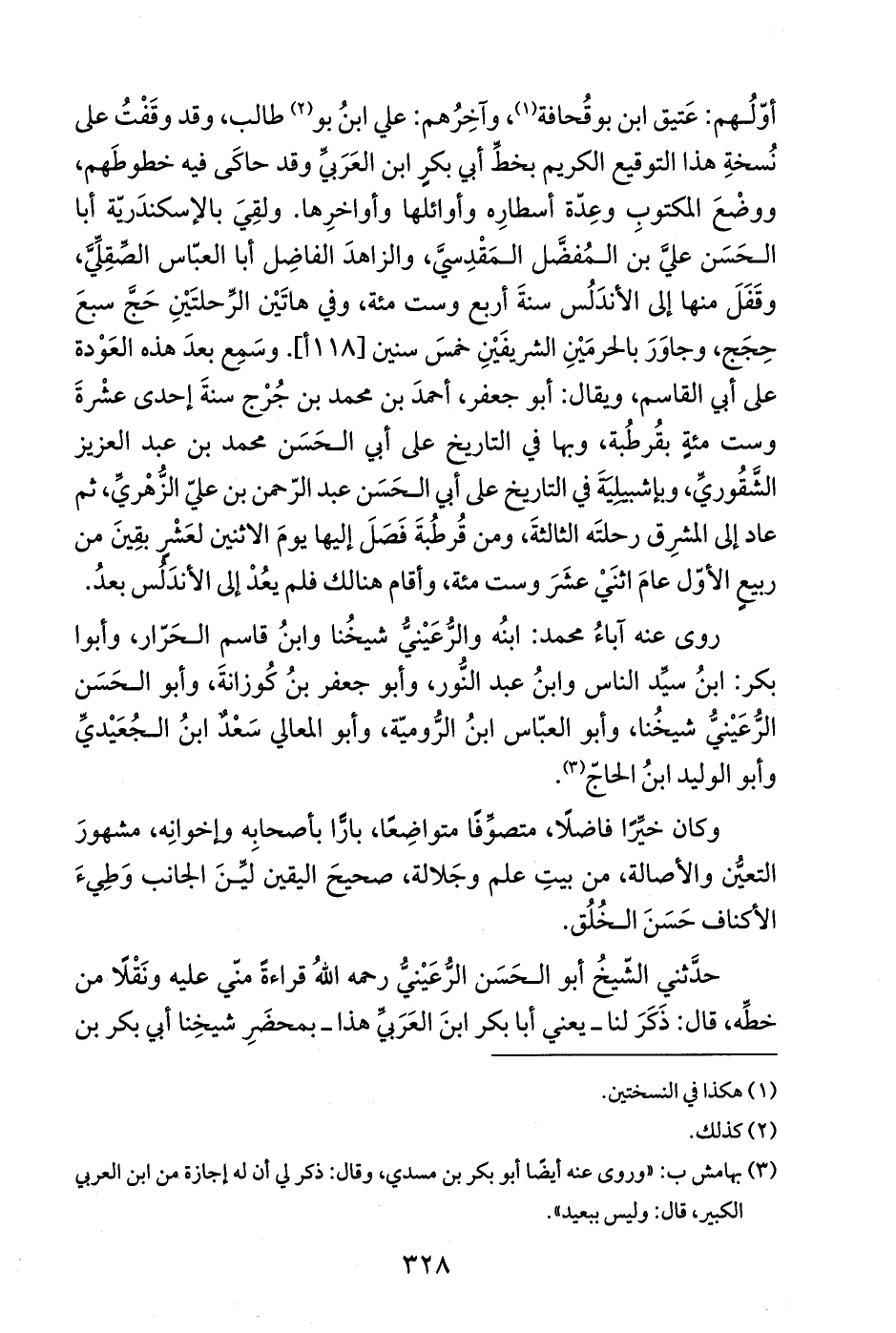 حدَّثني الشّيخُ أبو الحَسَن الرُّعَيْنيُّ رحمه اللهُ قراءةً منّي عليه ونَقْلًا من خطِّه، قال: ذَكَرَ لنا -يعني أبا بكر ابنَ العَرَبيِّ هذا- بمحضَرِ شيخِنا أبي بكر بن