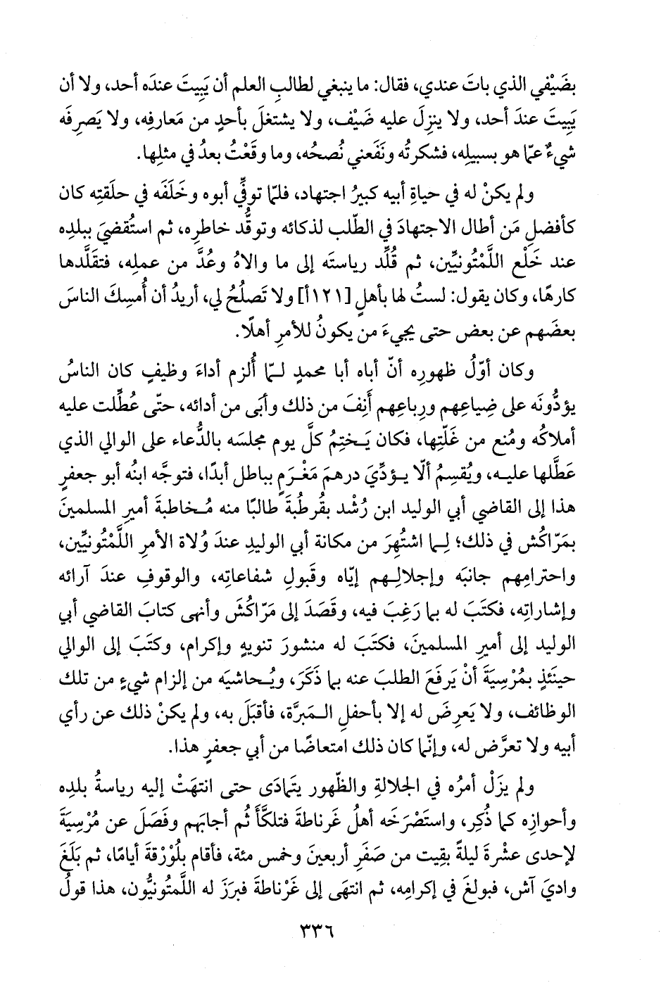 ولم يكنْ له في حياةِ أبيه كبيرُ اجتهاد، فلمّا توفِّي أبوه وخَلَفَه في حلَقتِه كان كأفضلِ مَن أطال الاجتهادَ في الطّلب لذكائه وتوقُّد خاطرِه، ثم استُقضيَ ببلدِه عند خَلْع اللَّمْتُونيِّين، ثم قُلِّد رياستَه إلى ما والاهُ وعُدَّ من عملِه، فتقَلَّدها كارهًا، وكان يقول: لستُ لها بأهلٍ ولا تَصلُحُ لي، أريدُ أن أُمسِكَ الناسَ بعضَهم عن بعض حتى يجيءَ من يكونُ للأمرِ أهلًا.