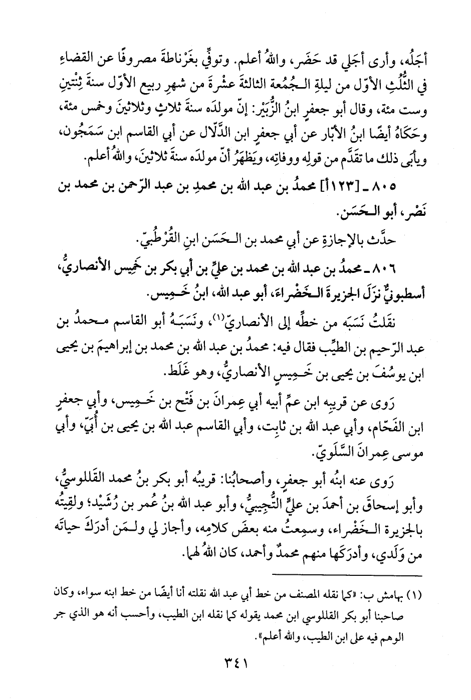 (¬1) بهامش ب: "كما نقله المصنف من خط أبي عبد الله نقلته أنا أيضًا من خط ابنه سواء، وكان صاحبنا أبو بكر القللوسي ابن محمد يقوله كما نقله ابن الطيب، وأحسب أنه هو الذي جر الوهم فيه على ابن الطيب، والله أعلم".