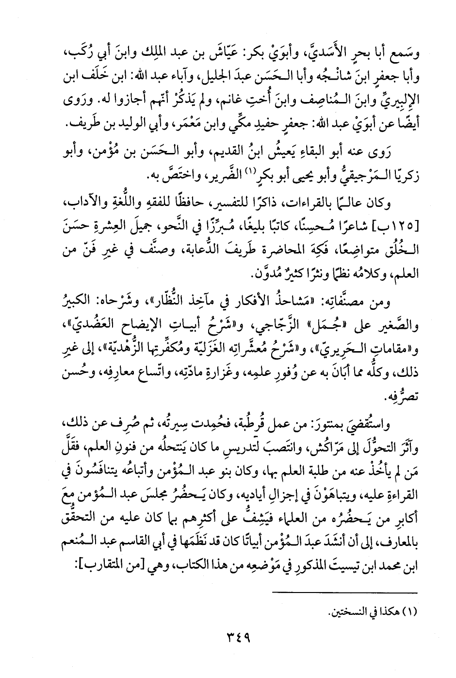 واستُقضيَ بمنتورَ: من عمل قُرطُبة، فحُمِدت سِيرتُه، ثم صُرِف عن ذلك، وآثَرَ التحوُّلَ إلى مَرّاكُش، وانتَصبَ لتدريسِ ما كان يَنتحلُه من فنونِ العلم، فقَلَّ مَن لم يأخُذْ عنه من طلبة العلم بها، وكان بنو عبد المُؤْمن وأتباعُه يتنافَسُونَ في القراءةِ عليه، ويتباهَوْنَ في إجزالِ أياديه، وكان يَحضُرُ مجلسَ عبد المُؤمن معَ أكابرِ من يَحضُرُه من العلماء فيَشِفُّ على أكثرِهم بما كان عليه من التحقُّق بالمعارف، إلى أن أنشَدَ عبدَ المُؤْمن أبياتًا كان قد نَظَمَها في أبي القاسم عبد المُنعم ابن محمد ابن تيسيتَ المذكورِ في مَوْضعِه من هذا الكتاب، وهي [من المتقارب]:
