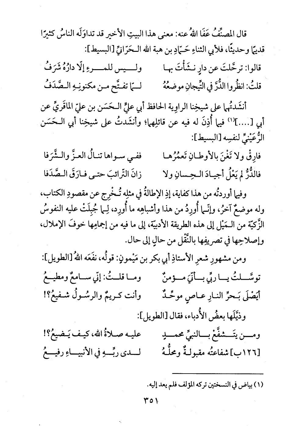 قال المصنِّفُ عَفَا اللهُ عنه: معنى هذا البيتِ الأخير قد تداوَلَه الناسُ كثيرًا قديمًا وحديثًا، فلأبي الثناءِ حَمّادِ بن هبة الله الحَرّانيِّ [البسيط]: