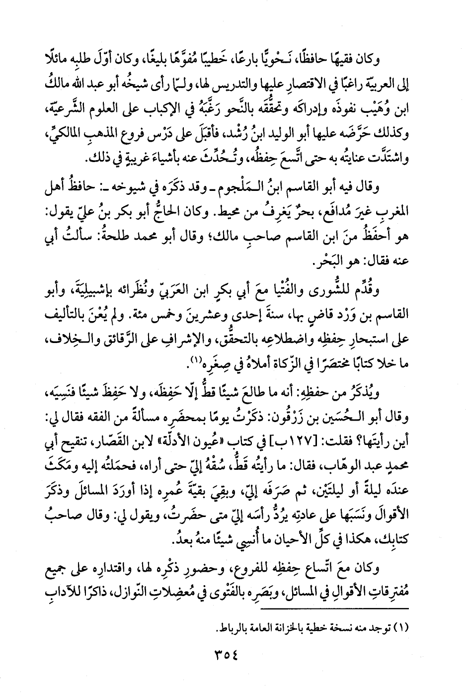 وكان معَ اتّساع حِفظِه للفروع، وحضورِ ذكْرِه لها، واقتدارِه على جميع مُفترِقاتِ الأقوالِ في المسائل، وبَصَرِه بالفَتْوى في مُعضِلاتِ النّوازل، ذاكرًا للآدابِ