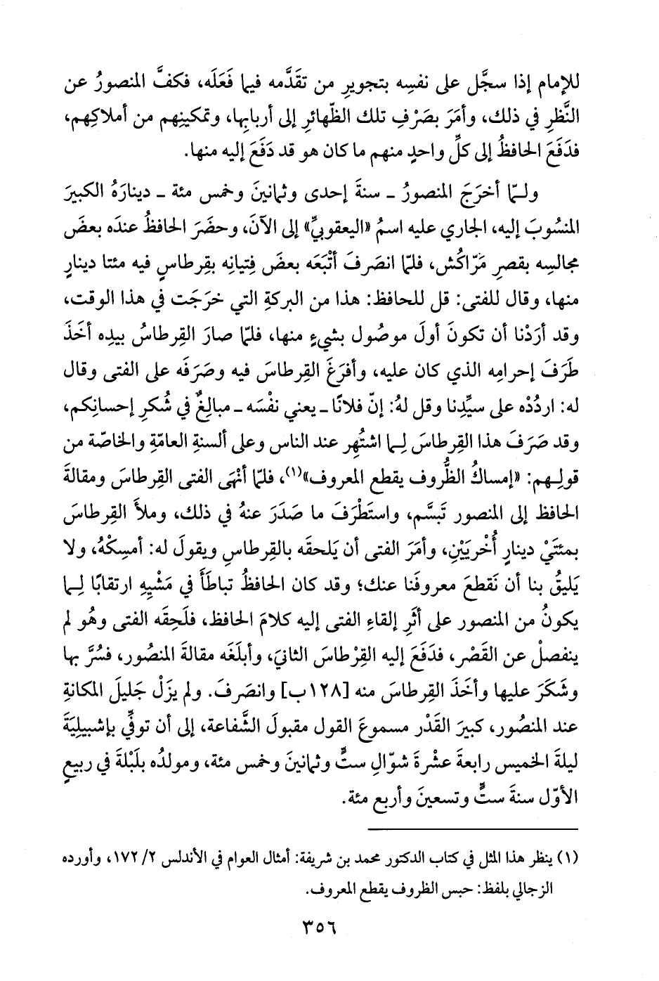 للإمام إذا سجَّل على نفسِه بتجويرِ من تقَدَّمه فيما فَعَلَه، فكفَّ المنصورُ عن النَّظرِ في ذلك، وأمَرَ بصَرْفِ تلك الظّهائرِ إلى أربابِها، وتمكينِهم من أملاكِهم، فدَفَعَ الحافظُ إلى كلِّ واحدٍ منهم ما كان هو قد دَفَعَ إليه منها.