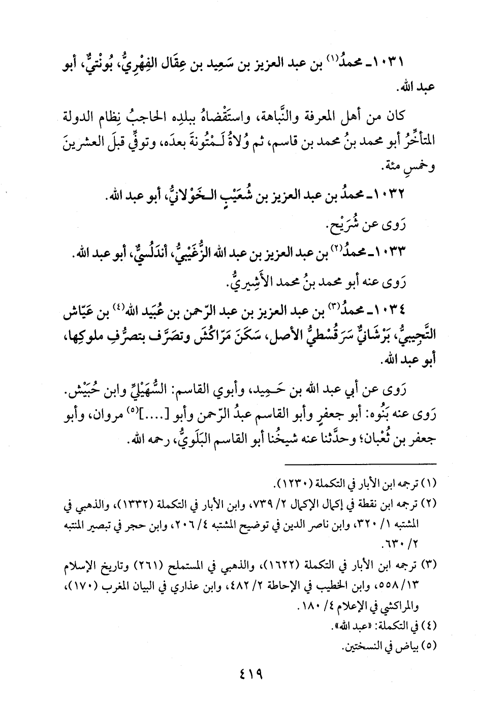 1034 - محمدُ (¬3) بن عبد العزيز بن عبد الرحمن بن عُبَيد الله (¬4) بن عَياش التَّجيبيُّ، بَرْشَانيٌّ سَرَقُسْطيُّ الأصل، سَكَنَ مَرّاكُشَ وتصَرَّف بتصرُّفِ ملوكِها، أبو عبد الله.
