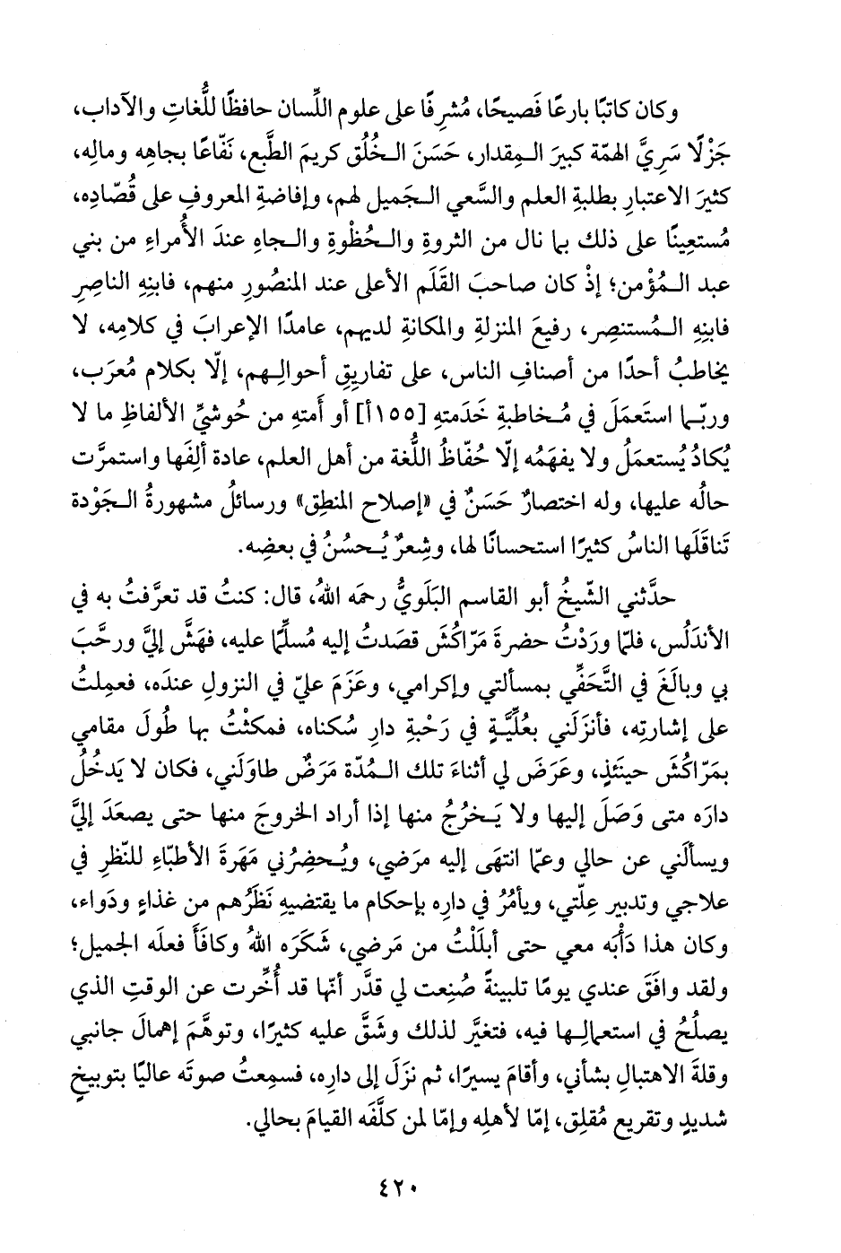 وكان كاتبًا بارعًا فَصيحًا، مُشرِفًا على علوم اللِّسان حافظًا للُّغاتِ والآداب، جَزْلًا سَرِيَّ الهمّة كبيرَ المِقدار، حَسَنَ الخُلُق كريمَ الطَّبع، نَفّاعًا بجاهِه ومالِه، كثيرَ الاعتبارِ بطلبةِ العلم والسَّعي الجَميل لهم، وإفاضةِ المعروفِ على قُصّادِه، مُستعِينًا على ذلك بما نال من الثروةِ والحُظْوةِ والجاهِ عندَ الأُمراءِ من بني عبد المُؤْمن؛ إذْ كان صاحبَ القَلَم الأعلى عند المنصُورِ منهم، فابنِهِ الناصِرِ فابنِهِ المُستنصِر، رفيعَ المنزلةِ والمكانةِ لديهم، عامدًا الإعرابَ في كلامِه، لا يخاطبُ أحدًا من أصنافِ الناس، على تفارِيقِ أحوالِهم، إلا بكلام مُعرَب، وربّما استَعمَلَ في مُخاطبةِ خَدَمتهِ [155 أ] أو أَمتهِ من حُوشيِّ الألفاظِ ما لا يُكادُ يُستعمَلُ ولا يفهَمُه إلا حُفّاظُ اللُّغة من أهل العلم، عادة ألِفَها واستمرَّت حالُه عليها, وله اختصارٌ حَسَنٌ في "إصلاح المنطِق" ورسائلُ مشهورةُ الجَوْدة تَناقَلَها النَّاسُ كثيرًا استحسانًا لها، وشِعرٌ يُحسُنُ في بعضِه.