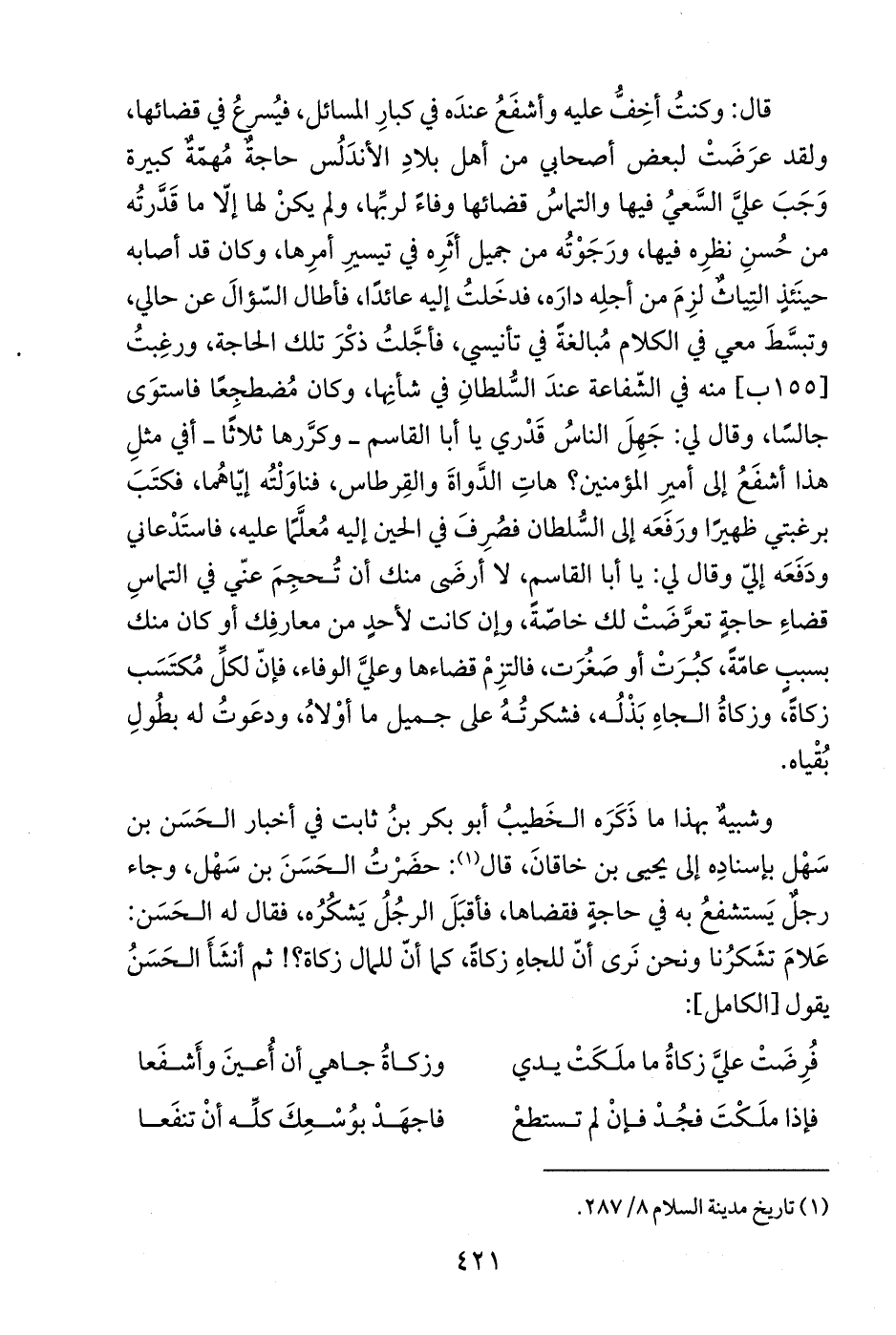 وشبيهٌ بهذا ما ذَكَرَه الخَطيبُ أبو بكر بنُ ثابت في أخبار الحَسَن بن سَهْل بإسنادِه إلى يحيى بن خاقانَ، قال (¬1): حضَرْتُ الحَسَنَ بن سَهْل، وجاء رجلٌ يَستشفعُ به في حاجةٍ فقضاها، فأقبَلَ الرجُلُ يَشكُرُه، فقال له الحَسَن: عَلامَ تشَكرُنا ونحن نَرى أنّ للجاهِ زكاةً، كما أنّ للمال زكاة؟! ثم أنشَأَ الحَسَنُ يقول [الكامل]: