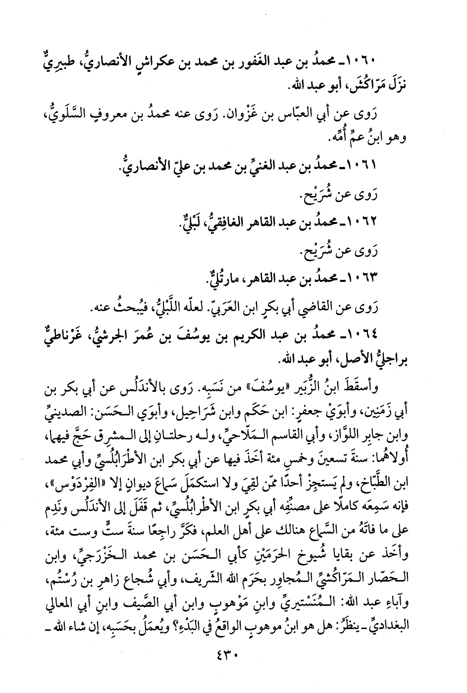 1060 - محمدُ بن عبد الغَفور بن محمد بن عكراشٍ الأنصاريُّ، طبريٌّ نزَلَ مَرّاكُشَ، أبو عبد الله.