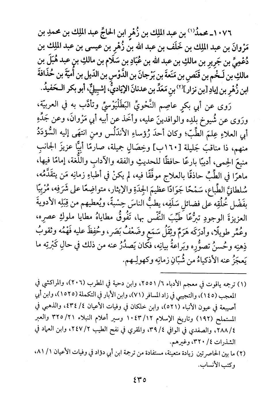 1076 - محمدُ (¬1) بن عبد الملِك بن زُهْرٍ ابن الحاجِّ عبد الملِك بن محمدِ بن مَرْوانَ بن عبد الملِك بن خَلَف بن عبد الله بن زُهْرِ بن عيسى بن عبد الملِك بن دُعْمِيِّ بن جَرِيرِ بن مالكِ بن عبد الله بن عُبَادِ بن سَلَام بن مالكِ بن عبد هُبَلَ بن مالكِ بن لَخْم بن قَنَصِ بن مَنَعةَ بن بَرْجانَ بن الدَّوْسِ بن الدّيل بن أُميّةَ بن حُذَافةَ ابن زُهْرِ بن إيادِ [بن نزار] (¬2) بنِ مَعَدِّ بن عدنانَ الإيَاديُّ، إشبِيليٌّ، أبو بكر الحَفيدُ.