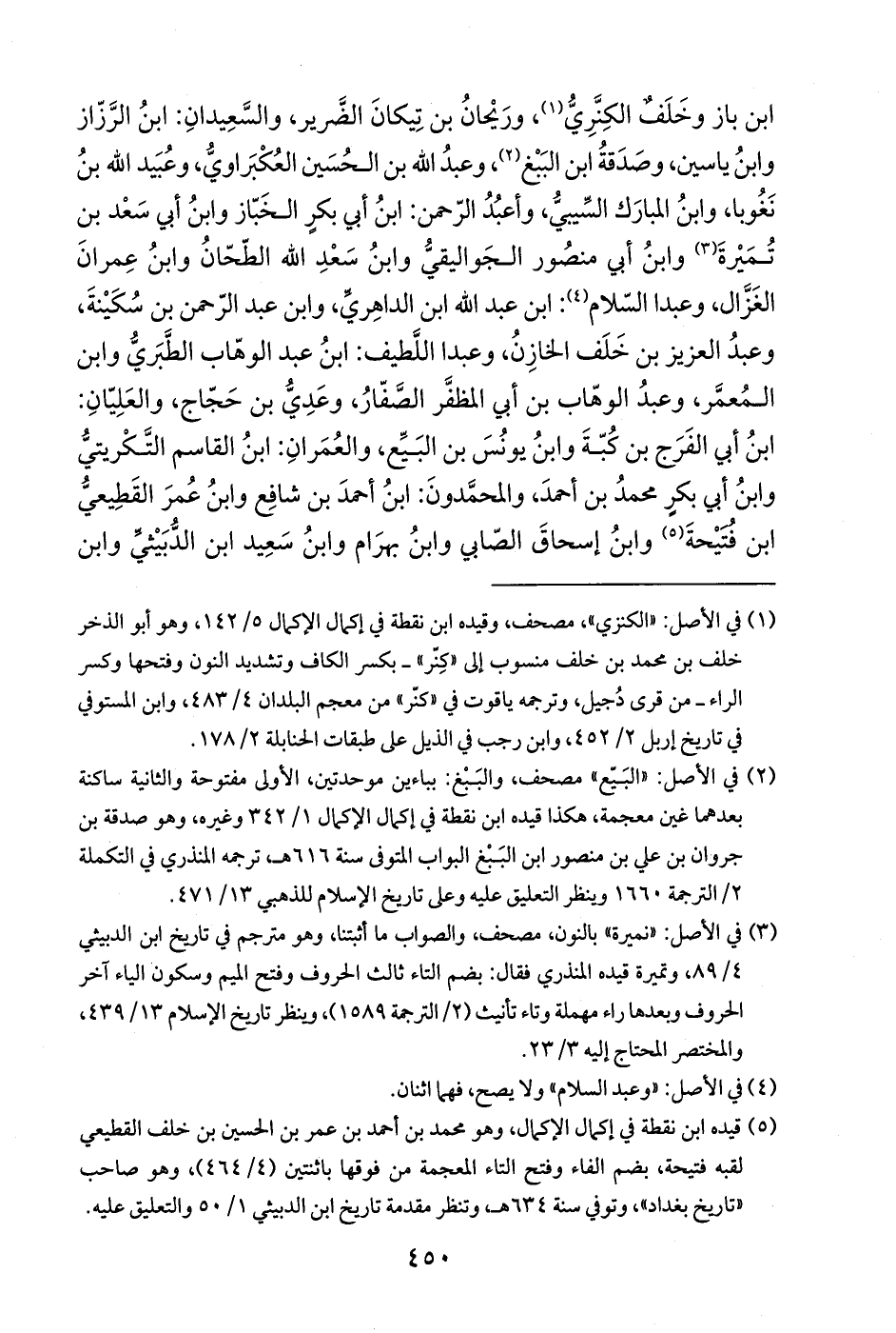 (¬2) في الأصل: "البَيّع" مصحف، والبَبْغ: بباءين موحدتين، الأولى مفتوحة والثانية ساكنة بعدهما غين معجمة، هكذا قيده ابن نقطة في إكمال الاكمال 1/ 342 وغيره، وهو صدقة بن جروان بن علي بن منصور ابن البَبْغ البواب المتوفى سنة 616 هـ، ترجمه المنذري في التكملة 2/الترجمة 1660 وينظر التعليق عليه وعلى تاريخ الإسلام للذهبي 13/ 471.