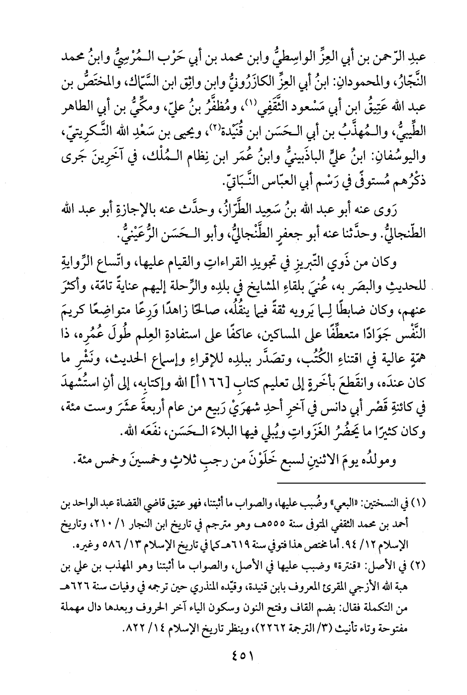 وكان من ذَوي التّبريزِ في تجويدِ القراءاتِ والقيام عليها، واتّساع الرِّوايةِ للحديثِ والبصَر به، عُنيَ بلقاءِ المشايخ في بلدِه والرِّحلة إليهم عنايةً تامّة، وأكثرَ عنهم، وكان ضابطًا لِما يَرويه ثقةً فيما ينقُلُه، صالحًا زاهدًا وَرِعًا متواضِعًا كريمَ النَّفْس جَوَادًا متعطِّفًا على المساكين، عاكفًا على استفادةِ العِلم طُولَ عُمُرِه، ذا همّةٍ عالية في اقتناءِ الكُتُب، وتصدَّر ببلدِه للإقراءِ وإسماع الحديث، ونَشْرِ ما كان عندَه، وانقَطعَ بأخَرةٍ إلى تعليم كتابِ [166 أ] الله وإكتابِه، إلى أنِ استُشهدَ في كائنةِ قَصْر أبي دانس في آخرِ أحدِ شهرَيْ رَبيع من عام أربعةَ عشَرَ وست مئة، وكان كثيرًا ما يَحضُرُ الغَزَواتِ ويُبلي فيها البلاءَ الحَسَن، نفَعَه الله.