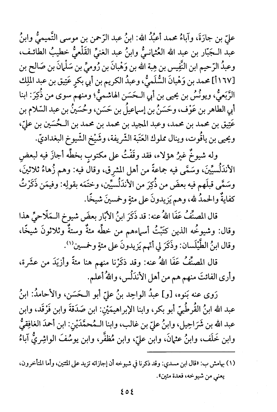 (¬1) بهامش ب: "قال ابن مسدي: وقد ذكرنا في شيوخه أن إجازاته تزيد على المئتين، وأما المتأخرون، يعني من شيوخه، فعدة مئين".