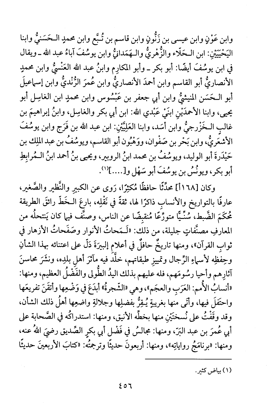وكان [168 أ] محدِّثًا حافظًا مُكثِرًا، رَوى عن الكبيرِ والنَّظير والصَّغير، عارفًا بالتواريخ والأنساب ذاكرًا لها، ثقةً في نَقْلِه، بارعَ الخَطّ رائقَ الطريقة محُكَمَ الضَّبط، سُنِّيًّا متورِّعَا مُنقبِضًا عن الناس، وصنَّف فيما كان يَنتحلُه من المعارفِ مصنَّفاتِ جليلة، من ذلك: "لَمَحاتُ الأنوار وصَفَحاتُ الأزهار في ثوابِ القرآن"، ومنها تاريخٌ حافلٌ في أعلامِ إلبيرَةَ دَلّ على اعتنائه بهذا الشأنِ وحِفظِه لأسماءِ الرّجال وتمييزِ طبقاتهم، خلَّد فيه مآثرَ أهلِ بلدِه، ونشَرَ محاسنَ آثارِهم وأحيا رسُومَهم، فله عليهم بذلك اليدُ الطُّولى والفَضْلُ العظيم، ومنها: "أنسابُ الأُمم: العَرَبِ والعجَم"، وهي"الشّجرةُ" أبدَعَ في وَضْعِها وأتقَنَ تفريعَها واحتَفلَ فيها، وأتَى منها بغريبةٍ يُقِرُّ بفضلِها وجلالةِ واضعِها أهلُ ذلك الشأن، وقد وقَفْتُ على نُسختَيْنِ منها بخطِّه الأنيق، ومنها: استدراكُه في الصَّحابة على أبي عُمرَ بن عبد البَرّ، ومنها: مجالسُ في فَضْل أبي بكرِ الصِّديق رضيَ اللهُ عنه، ومنها: "برنامَجُ رواياتِه"، ومنها: أربعونَ حديثًا وترجمتُه: "كتابَ الأربعينَ حديثًا