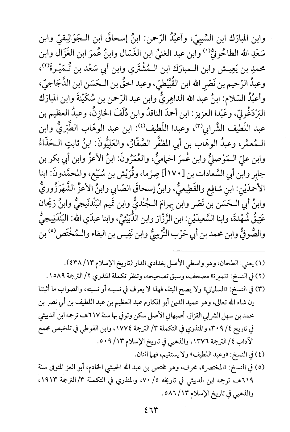 وابن المبارَك ابن السِّيبِيّ، وأعبُدُ الرّحمن: ابنُ إسحاقَ ابن الجَوَالِيقيّ وابن سَعْدِ الله الطاحُونيُّ (¬1) وابن عبد الغنيِّ ابن الغَسّال وابنُ عُمرَ ابن الغَزَال وابن محمدِ بن يَعِيش وابن المبارَك ابن المُشْتَري وابن أبي سَعْد بن تُمَيْرةَ (¬2)، وعبدُ الرّحيم بن نَصْرِ الله ابن القُبَّيْطيّ، وعبد الحقِّ بن الحَسَن ابن الدَّجَاجيّ، وأعبُدُ السّلام: ابنُ عبد الله الداهِريُّ وابن عبد الرّحمن بن سُكَيْنةَ وابن المبارَك البَرْدَغُوليّ، وعَبْدا العزيز: ابن أحمدَ الناقدُ وابن دُلَفَ الخازِنُ، وعبدُ العظيم بن عبد اللّطيف الشَّرابي (¬3)، وعبدا اللّطيف (¬4): ابن عبد الوهّاب الطَّبَريُّ وابن المُعمَّر، وعبدُ الوهّاب بن أبي المظفَّر الصَّفّارُ، والعَلِيُّونَ: ابنُ ثابتٍ الحَذّاءُ وابن عليّ المَوْصليُّ وابن عُمرَ الحماميُّ، والعُمَرُونَ: ابنُ الأعزِّ وابن أبي بكر بن جابِر وابن أبي السَّعادات بن صِرْما، وقُرَيْش بن سُبَيعْ، والمحمَّدونَ: ابنا الأحمدَيْنِ: ابنِ شافِع والقَطِيعيُّ، وابنُ إسحاقَ الصّابي وابنُ الأعزِّ الشَّهْرَزُوريُّ وابنُ أبي الحَسَن بن نَصْر وابن بِهرامَ الجُنْديُّ وابن تَميم البَنْدنَيجيُّ وابنُ رَيْحان عَتِيقُ شُهْدةَ، وابنا السَّعيدَيْنِ: ابن الرَّزّاز وابن الدُّبَيْثيِّ، وابنا عبدَي الله: البَنْدَنِيجيُّ والصُّوفيُّ وابن محمد بن أبي حَرْب النَّرْسِيُّ وابن نَفِيس بن البقاء والمُخْتَص (¬5) بن