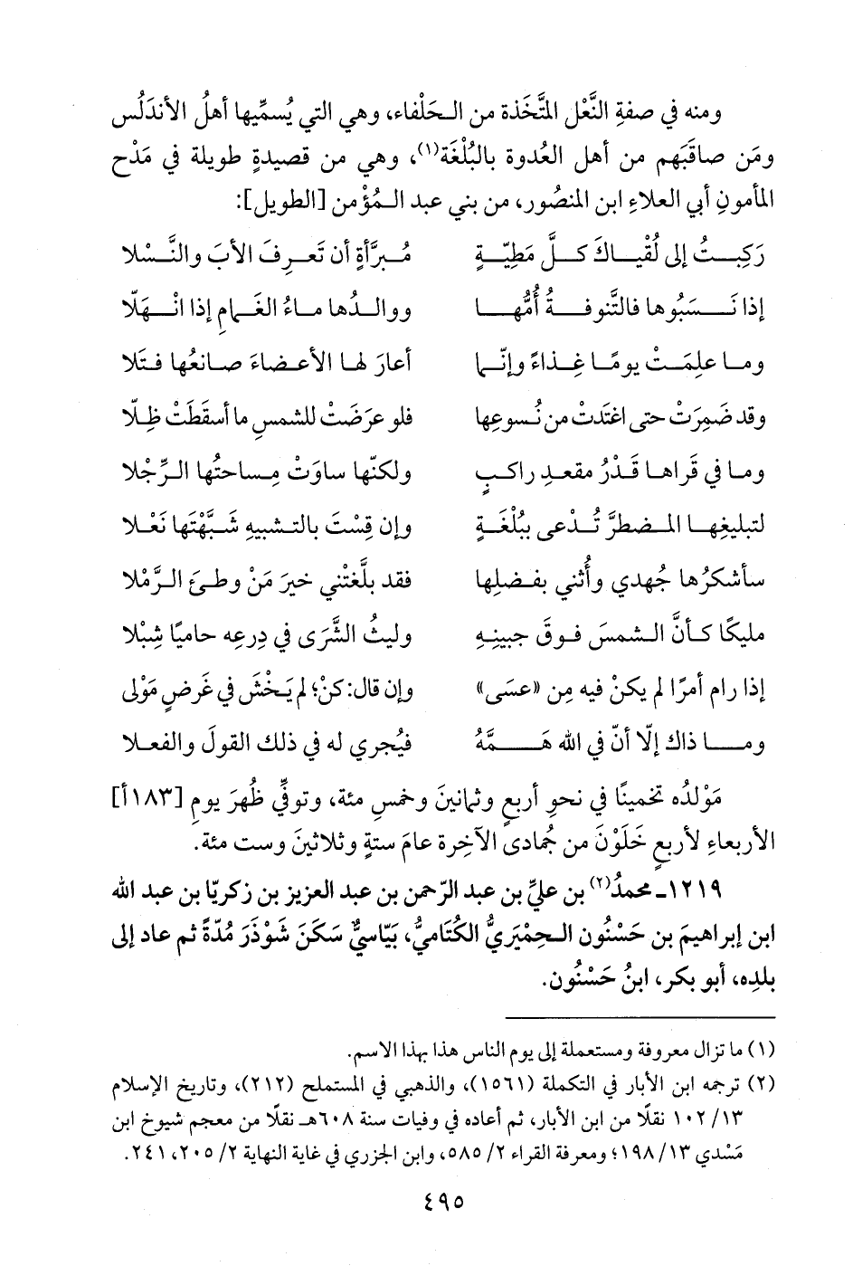 ومنه في صفةِ النَّعْل المتَّخَذة من الحَلْفاء، وهي التي يُسمِّيها أهلُ الأندَلُس ومَن صاقَبَهم من أهل العُدوة بالبُلْغَة (¬1)، وهي من قصيدةٍ طويلة في مَدْح المأمونِ أبي العلاءِ ابن المنصُور، من بني عبد المُؤْمن [الطويل]: