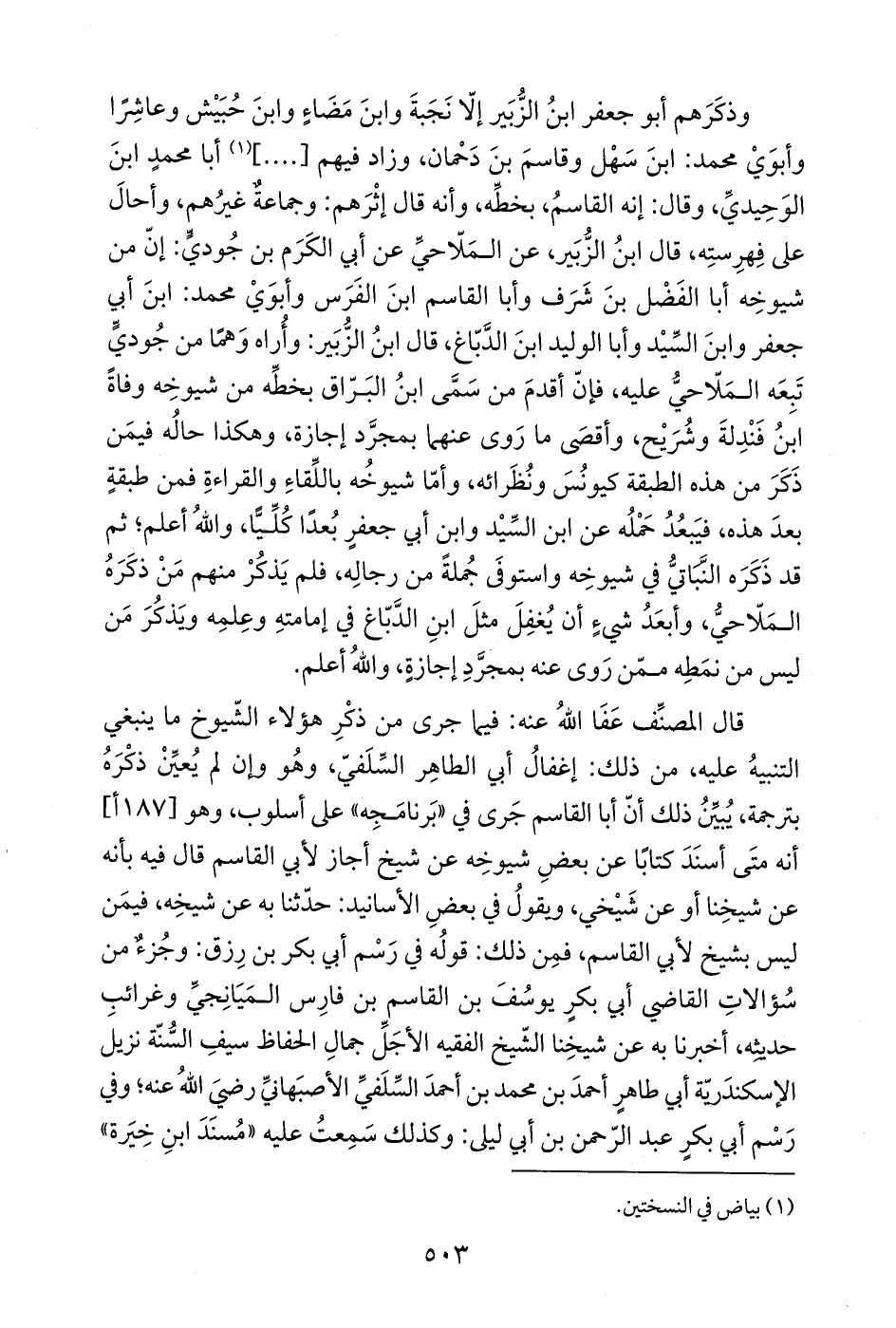 قال المصنِّف عَفَا اللهُ عنه: فيما جرى من ذكْرِ هؤلاء الشّيوخ ما ينبغي التنبيهُ عليه، من ذلك: إغفالُ أبي الطاهِر السِّلَفيّ، وهُو وإن لم يُعيِّنْ ذكْرَهُ بترجمة، يُبيِّنُ ذلك أنّ أبا القاسم جَرى في "بَرنامَجِه" على أسلوب، وهو أنه متَى أسنَدَ كتابًا عن بعضِ شيوخِه عن شيخ أجاز لأبي القاسم قال فيه بأنه عن شيخِنا أو عن شَيْخي، ويقولُ في بعضِ الأسانيد: حدّثنا به عن شيخِه، فيمَن ليس بشيخ لأبي القاسم، فمِن ذلك: قولُه في رَسْم أبي بكر بن رِزق: وجُزءٌ من سُؤالاتِ القاضي أبي بكرٍ يوسُفَ بن القاسم بن فارِس المَيَانِجيِّ وغرائبِ حديثه، أخبرنا به عن شيخِنا الشّيخ الفقيه الأجَلِّ جمالِ الحفاظ سيفِ السُّنّة نزيل الإسكندَرّية أبي طاهرٍ أحمدَ بن محمد بن أحمدَ السِّلَفيِّ الأصبَهانيِّ رضيَ اللهُ عنه؛ وفي رَسْم أبي بكر عبد الرّحمن بن أبي ليلى: وكذلك سَمِعتُ عليه "مُسنَدَ ابنِ خِيَرة"