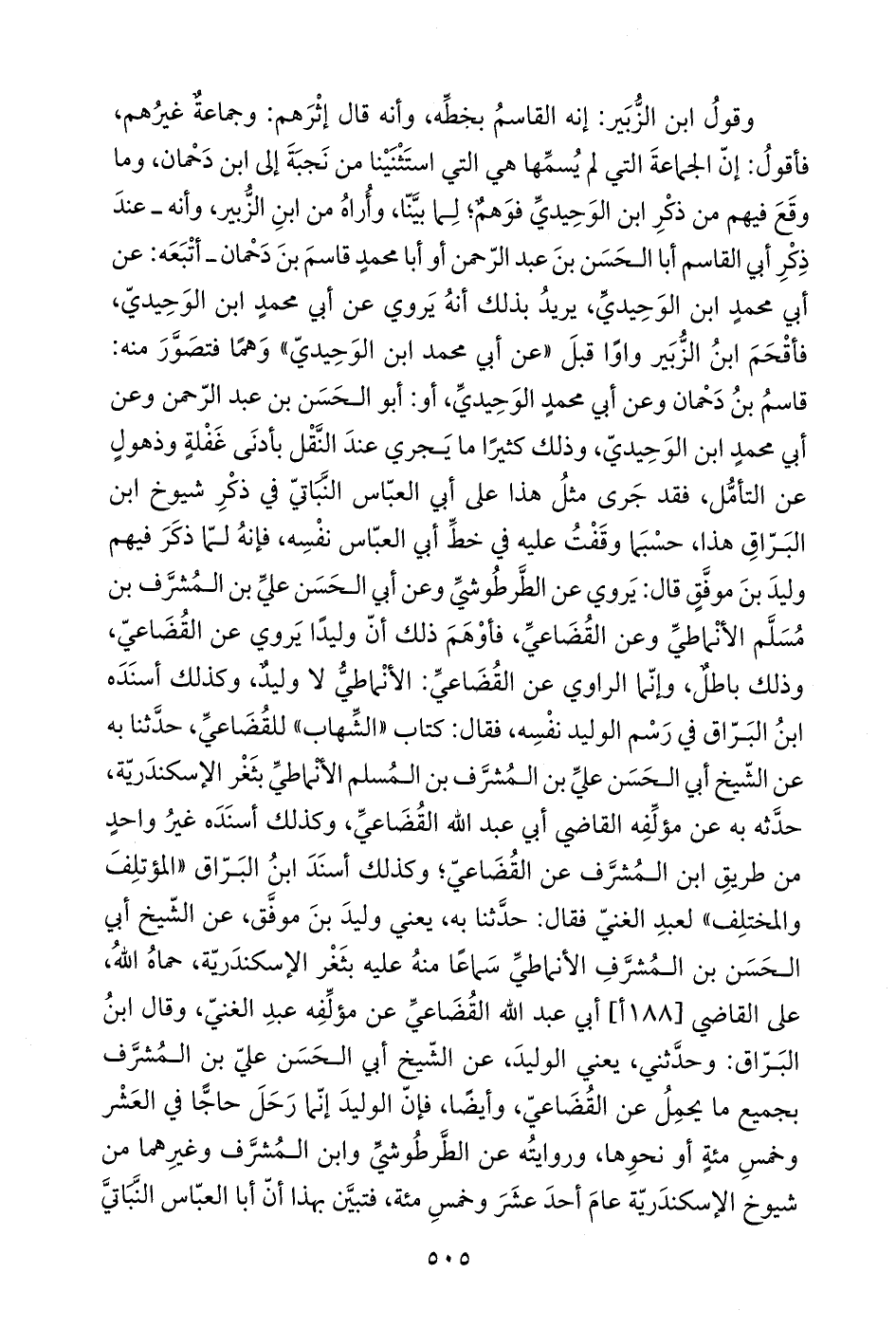 وقولُ ابن الزُّبَير: إنه القاسمُ بخطِّه، وأنه قال إثْرَهم: وجماعةٌ غيرُهم، فأقولُ: إنّ الجماعةَ التي لم يُسمِّها هي التي استَثْنَيْنا من نَجبَةَ إلى ابن دَحْمان، وما وقَعَ فيهم من ذكْرِ ابن الوَحِيديِّ فوَهمٌ؛ لِما بيَّنّا، وأُراهُ من ابنِ الزُّبير، وأنه -عندَ ذِكْرِ أبي القاسم أبا الحَسَن بنَ عبد الرّحمن أو أبا محمدٍ قاسمَ بنَ دَحْمان- أتْبَعَه: عن أبي محمدٍ ابن الوَحِيديِّ، يريدُ بذلك أنهُ يَروي عن أبي محمدٍ ابن الوَحِيديّ، فأقْحَمَ ابنُ الزُّبَير واوًا قبلَ "عن أبي محمد ابن الوَحِيديّ" وَهمًا فتصوَّرَ منه: قاسمُ بنُ دَحْمان وعن أبي محمدٍ الوَحِيديِّ، أو: أبو الحَسَن بن عبد الرّحمن وعن أبي محمدٍ ابن الوَحِيديِّ، وذلك كثيرًا ما يَجري عندَ النَّقْل بأدنَى غَفْلةٍ وذهولٍ عن التأمُّل، فقد جَرى مثلُ هذا على أبي العبّاس النَّباتيّ في ذكْرِ شيوخ ابن البَرّاقِ هذا، حسْبَما وقَفْتُ عليه في خطِّ أبي العبّاس نفْسِه، فإنهُ لمّا ذكَرَ فيهم وليدَ بنَ موفَّقٍ قال: يَروي عن الطَّرطُوشيِّ وعن أبي الحَسَن عليِّ بن المُشرَّف بن مُسَلَّم الأنْماطيِّ وعن القُضَاعيِّ، فأوْهَمَ ذلك أنّ وليدًا يَروي عن القُضَاعيّ، وذلك باطلٌ، وإنّما الراوي عن القُضَاعيِّ: الأنْماطيُّ لا وليدٌ، وكذلك أسنَدَه ابنُ البَرّاق في رَسْم الوليد نفْسِه، فقال: كتاب "الشِّهاب" للقُضَاعيِّ، حدَّثنا به عن الشّيخ أبي الحَسَن عليِّ بن المُشرَّف بن المُسلم الأنْماطيِّ بثَغْر الإسكندَريّة، حدَّثه به عن مؤلِّفِه القاضي أبي عبد الله القُضَاعيِّ، وكذلك أسنَدَه غيرُ واحدٍ من طريقِ ابن المُشرَّف عن القُضَاعيّ؛ وكذلك أسنَدَ ابنُ البَرّاق "المؤتلِفَ والمختلِف" لعبدِ الغنيّ فقال: حدَّثنا به، يعني وليدَ بنَ موفَّق، عن الشّيخ أبي الحَسَن بن المُشرَّفِ الأنماطيِّ سَماعًا منهُ عليه بثَغْر الإسكندَريّة، حماهُ اللهُ، على القاضي أبي عبد الله القُضَاعيِّ عن مؤلِّفِه عبدِ الغنيّ، وقال ابنُ البَرّاق: وحدَّثني، يعني الوليدَ، عن الشّيخ أبي الحَسَن عليّ بن المُشرَّف بجميع ما يحمِلُ عن القُضَاعيّ، وأيضًا، فإنّ الوليدَ إنّما رَحَلَ حاجًّا في العَشْر وخمسِ مئةٍ أو نحوِها، وروايتُه عن الطَّرطُوشيِّ وابن المُشرَّف وغيرِهما من شيوخ الإسكندَريّة عامَ أحدَ عشَرَ وخمسِ مئة، فتبيَّن بهذا أنّ أبا العبّاس النَّبَاتيَّ