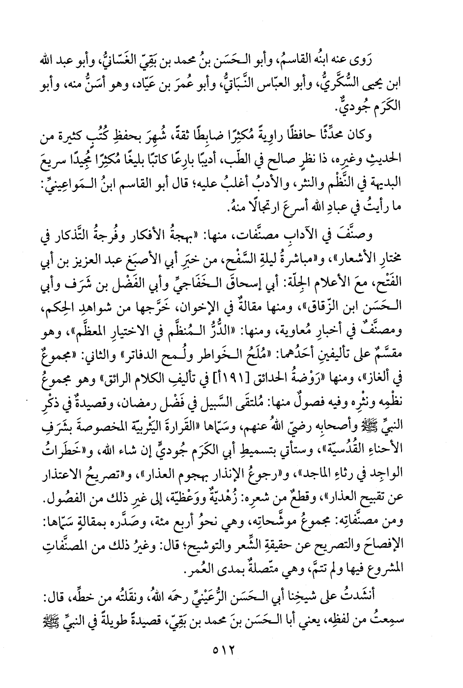 أنشَدتُ على شيخِنا أبي الحَسَن الرُّعَيْنيِّ رحمَه اللهُ، ونقَلتُه من خطِّه، قال: سمِعتُ من لفظِه، يعني أبا الحَسَن بنَ محمد بن بَقِيّ، قصيدةً طويلةً في النبيِّ - صلى الله عليه وسلم -