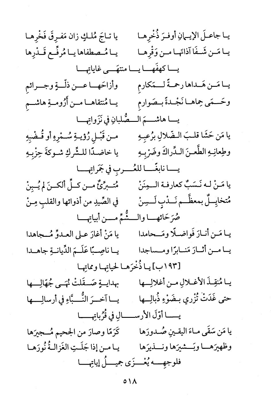 يا جاعلَ الإيمانِ أوفرَ ذُخْرِها ... يا تاجَ مُلكٍ زان مَفرِقَ فَخْرِها