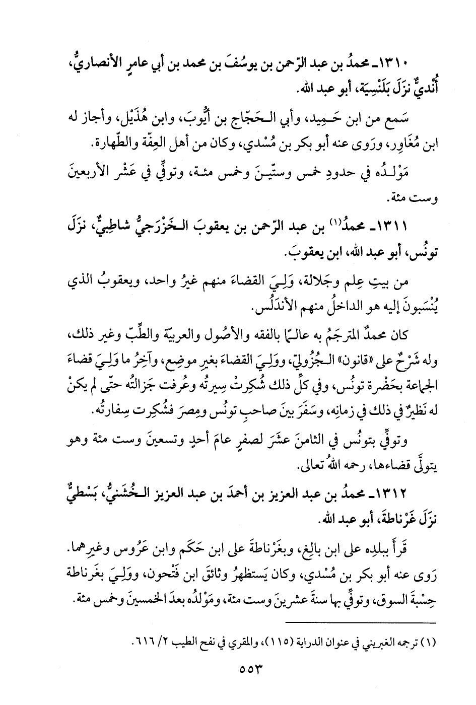 1311 - محمدُ (¬1) بن عبد الرّحمن بن يعقوبَ الخَزْرَجيُّ شاطِبيٌّ، نزَلَ تونُس، أبو عبد الله، ابن يعقوبَ.