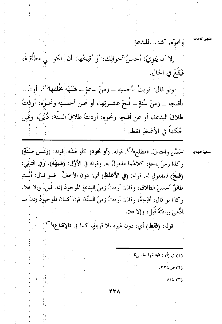 ونحوه كلِلْبِدْعَةِ إلَّا أَنْ يَنْوِيَ أَحْسَنَ أَحْوَالِك أَوْ أَقْبَحَهَا أَنْ ... كُونِي مُطَلَّقَةً فَيَقَعَ فِي الْحَالِ وَلَوْ قَالَ نَوَيْت بأَحْسَنَهُ زَمَنَ بِدْعَةٍ شَبَّهَهُ بِخُلُقِهَا أَوْ بأَقْبَحَهُ وَنَحْوَهُ مِنْ سُنَّةٍ لِقُبْحِ عِشْرَتِهَا أَوْ عَنْ أَحْسَنِهِ وَنَحْوِهِ أَرَدْتُ طَلَاقَ الْبِدْعَةِ أَوْ عَنْ أَقْبَحِهِ وَنَحْوِهِ أَرَدْتُ طَلَاقَ السُّنَّةِ دِينَ، وَقُبِلَ حُكْمًا فِي الْأَغْلَظِ فَقَطْ
