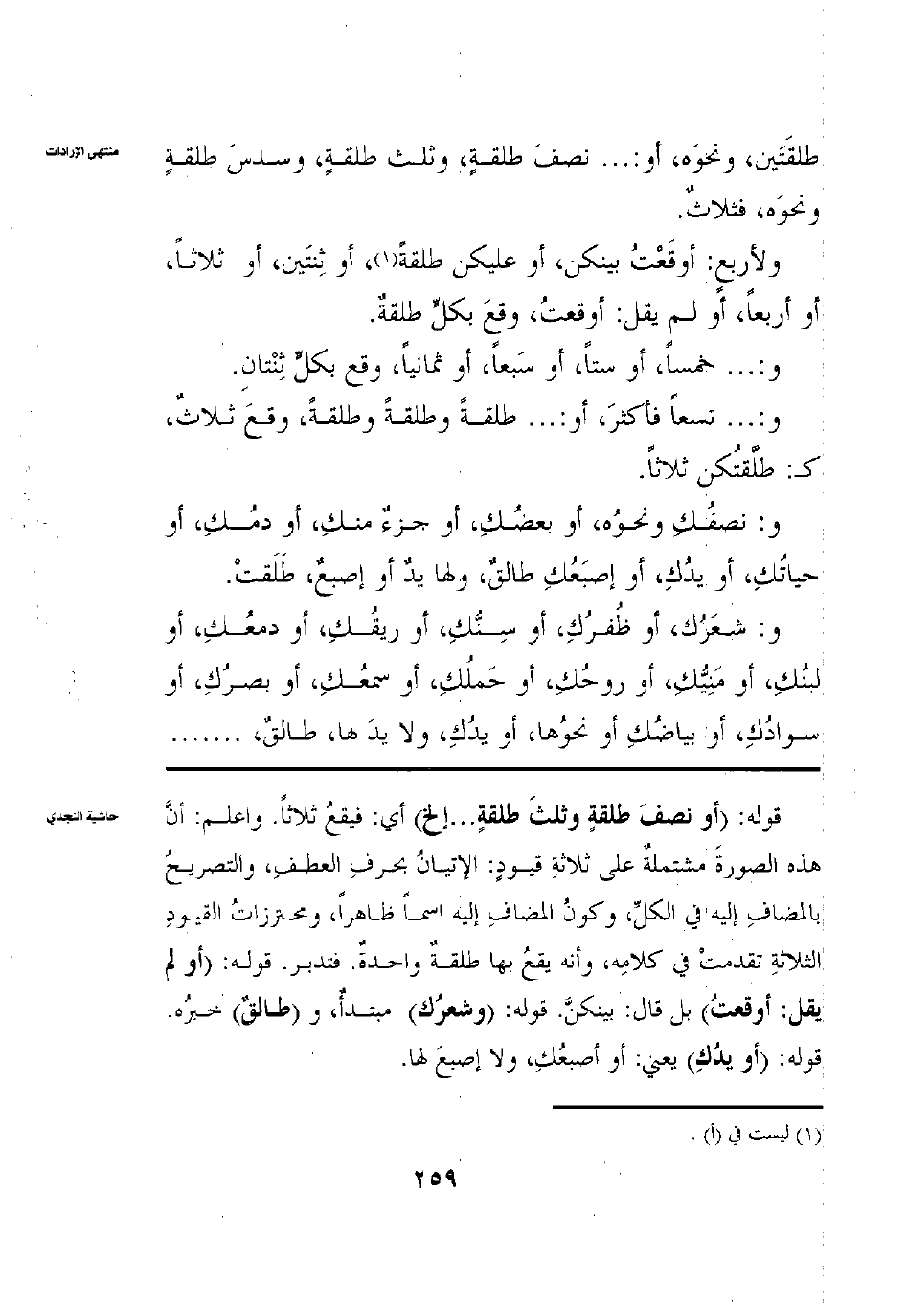 طَلْقَتَيْنِ وَنَحْوُهُ أَوْ نِصْفَ طَلْقَةٍ، وَثُلُثَ طَلْقَةٍ، وَسُدُسَ طَلْقَةٍ وَنَحْوَهُ فَثَلَاثٌ ولِأَرْبَعٍ أَوْقَعْت بَيْنكُنَّ أَوْ عَلَيْكُنَّ طَلْقَةً أَوْ ثِنْتَيْنِ أَوْ ثَلَاثًا أَوْ أَرْبَعًا أَوْ لَمْ يَقُلْ أَوْقَعْتُ وَقَعَ بِكُلِّ طَلْقَةٌ وخَمْسًا أَوْ سِتًّا أَوْ سَبْعًا أَوْ ثَمَانِيًا وَقَعَ بِكُلِّ ثِنْتَانِ وتِسْعًا فَأَكْثَرَ أَوْ طَلْقَةً، وَطَلْقَةً، وَطَلْقَةً وَقَعَ ثَلَاثُ كَطَلْقَتكُنَّ ثَلَاثًا ونِصْفُك، وَنَحْوُهُ أَوْ بَعْضُك أَوْ جُزْءٌ مِنْك أَوْ دَمُكِ أَوْ حَيَاتُكِ أَوْ يَدُكِ أَوْ أُصْبُعُكِ طَالِقٌ وَلَهَا يَدٌ وَأُصْبُعٌ طَلُقَتْ وشَعْرُكِ أَوْ ظُفْرُكِ أَوْ سِنُّكِ أَوْ رِيقُكِ أَوْ دَمْعُكِ أَوْ لَبَنُكِ أَوْ مَنِيُّكِ أَوْ رَوْحُكِ أَوْ حَمْلُكِ أَوْ سَمْعُكِ أَوْ بَصَرُكِ أَوْ سَوَادُكِ أَوْ بَيَاضُكِ أَوْ نَحْوُهَا أَوْ يَدُكِ وَلَا يَدَ لَهَا طَالِقٌ