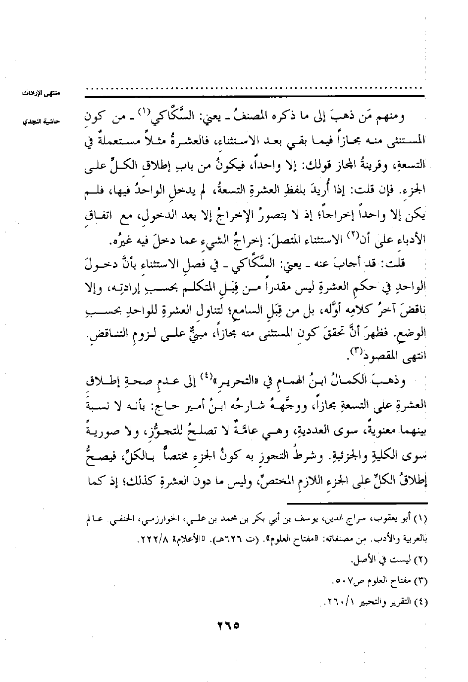 قلت: قد أجاب عنه -تعني: السكاكي- في فصل الاستثناء بأنَّ دخول الواحد في حكمِ العشرةِ ليس مقدراً من قبل المتكلم بحسب إرادته، وإلا ناقض آخر كلامه أوله، بل من قبل السامع؛ لتناول العشرة للواحد بحسب الوضع. فظهر أن تحقق كون المستثنى منه مجازا، مبني على لزومِ التناقض. انتهى المقصود. وذهب الكمال ابن الهمام في "التحرير" إلى عدم صحة إطلاق العشرة على التسعة مجازا، ووجهه شارحه ابن أمير حاج: بأنه لا نسبة بينهما معنويةً، سوى الكلية والجزئية. وشرط التجوز به كون الجزء مختصا بالكل، فيصح إطلاق الكل على الجزء اللازم المختص، وليس ما دون العشرة كذلك؛ إذ كما