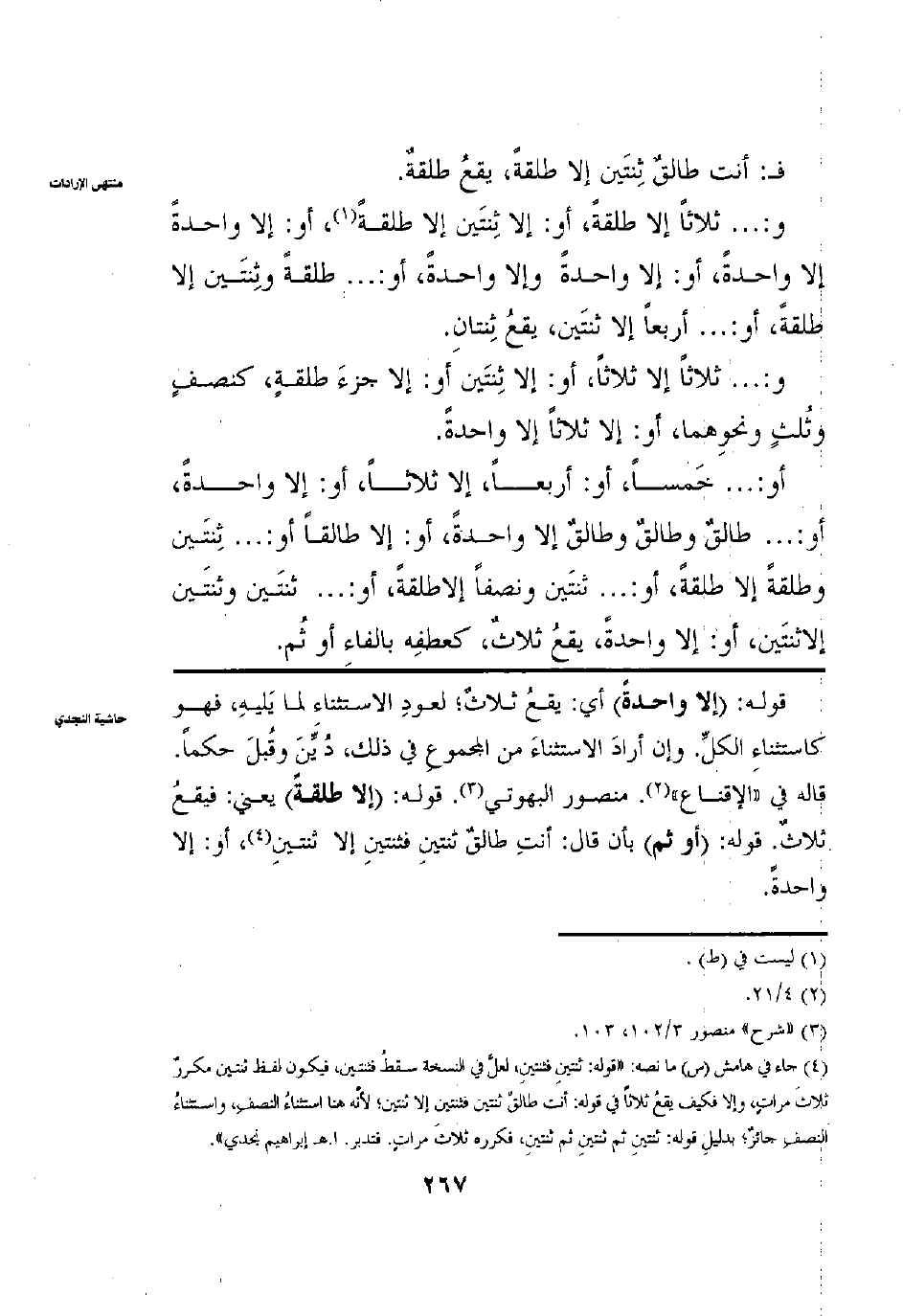 فأَنْتِ طَالِقٌ ثِنْتَيْنِ إلَّا طَلْقَةً طَلْقَةٌ وَاحِدَةٌ لِرَفْعِهِ الثَّانِيَةَ بِالِاسْتِثْنَاءِ وثَلَاثًا إلَّا طَلْقَةً وإلَّا ثِنْتَيْنِ إلَّا طَلْقَةً أَوْإلَّا وَاحِدَةً إلَّا وَاحِدَةً يَقَعُ ثِنْتَانِ أَوْ إلَّا وَاحِدَةً وَإِلَّا وَاحِدَةً أَوْ وَثِنْتَيْنِ إلَّا طَلْقَةً أَوْ أَرْبَعًا إلَّا ثِنْتَيْنِ يَقَعُ ثِنْتَانِ وأَنْتِ طَالِقٌ ثَلَاثًا إلَّا ثَلَاثًا أَوْ إلَّا ثِنْتَيْنِ أَوْ إلَّا جُزْءَ طَلْقَةٍ كَنِصْفٍ وَثُلُثٍ وَنَحْوِهِمَا أَوْ إلَّا ثَلَاثًا إلَّا وَاحِدَةً أَوْ خَمْسًا أَوْ أَرْبَعًا إلَّا ثَلَاثًا أَوْ طَالِقٌ أَرْبَعًا إلَّا وَاحِدَةً أَوْ طَالِقٌ وَطَالِقٌ وَطَالِقٌ إلَّا وَاحِدَةً أَوْ إلَّا طَالِقًا أَوْ ثِنْتَيْنِ وَطَلْقَةً إلَّا طَلْقَةً أَوْ ثِنْتَيْنِ وَنِصْفَ إلَّا طَلْقَةً أَوْ ثِنْتَيْنِ وَثِنْتَيْنِ إلَّا ثِنْتَيْنِ أَوْ إلَّا وَاحِدَةً يَقَعُ ثَلَاثُ كَعَطْفِهِ بِالْفَاءِ أَوْ بِثُمَّ