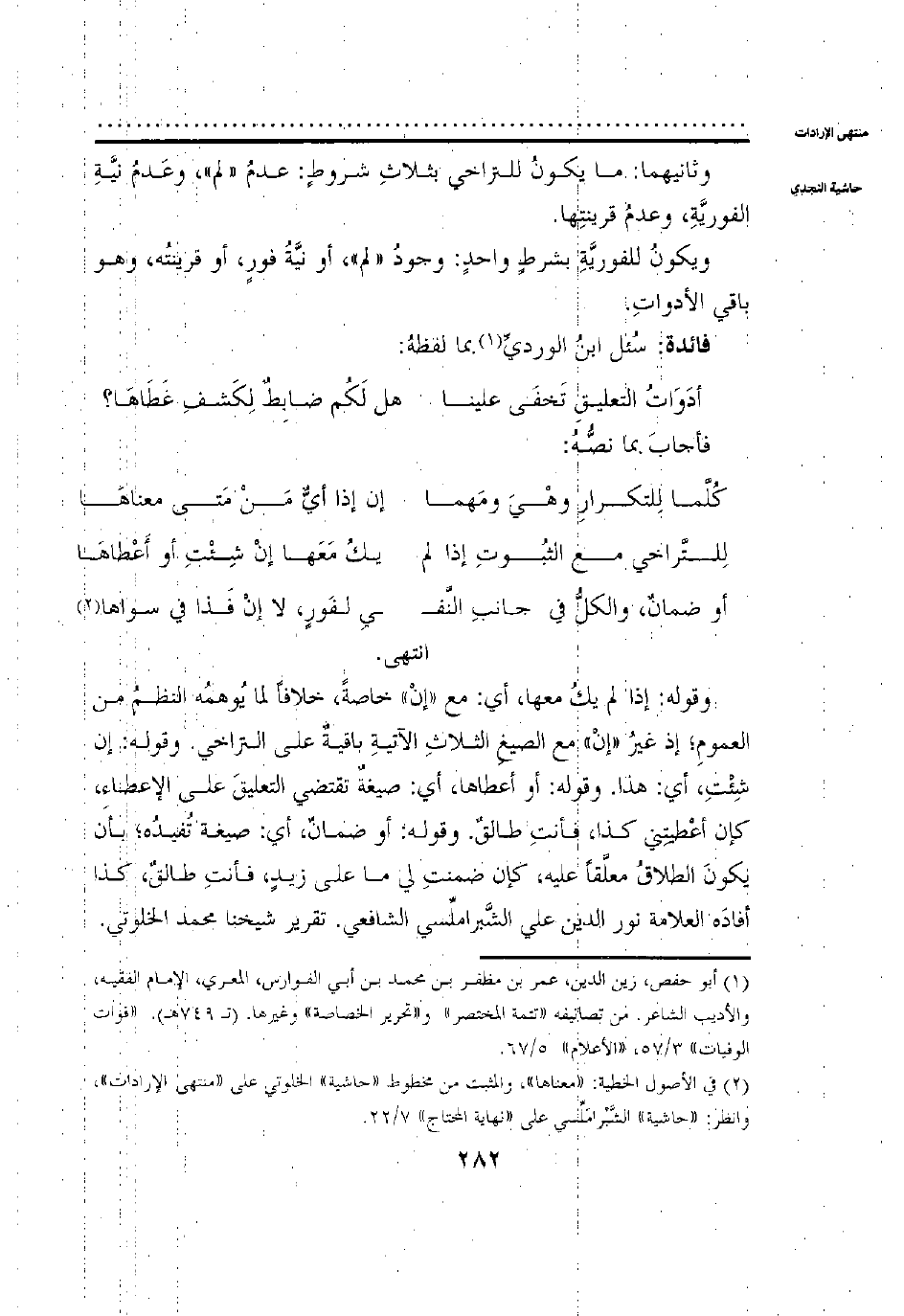 وقوله: إذا لم يك معها، أي: مع "إن" خاصة، خلافًا لما يوهمه النظم من العموم؛ إذ غير "إن" مع الصيغ الثلاث الآتية باقية على التراخي. وقوله: إن شئت، أي: هذا. وقوله: أو أعطاها، أي: صيغة تقتضي التعليق على الإعطاء، كإن أعطيتني كذا، فأنت طالق. وقوله: أو ضمان، أي: صيغة تفيده؛ بأن يكون الطلاق معلقًا عليه، كإن ضمنت لي ما على زيد، فأنت طالق، كذا أفاده العلامة نور الدين علي الشبراملسي الشافعي. تقرير شيخنا محمد الخلوتي.