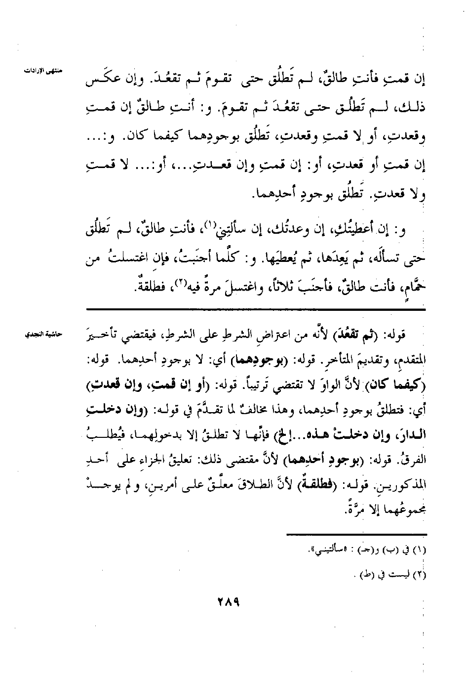 إنْ قُمْتِ فَأَنْتِ طَالِقٌ لَمْ تَطْلُقْ حَتَّى تَقُومَ ثُمَّ تَقْعُدَ وَإِنْ عَكَسَ ذَلِكَ لَمْ تَطْلُقْ حَتَّى تَقْعُدَ ثُمَّ تَقُومَ وأَنْتِ طَالِقٌ إنْ قُمْت وَقَعَدْتِ أَوْ لَا قُمْت وَقَعَدْتِ تَطْلُقُ بِوُجُودِهِمَا كَيْفَمَا كَانَ أَوْ إنْ قُمْت وَإِنْ قَعَدْت أَوْ لَا قُمْتِ وَلَا قَعَدْتِ تَطْلُقُ بِوُجُودِ أَحَدِهِمَا وإنْ أَعْطَيْتُك إنْ وَعَدْتُك إنْ سَأَلْتِينِي فَأَنْتِ طَالِقٌ لَمْ تَطْلُقْ حَتَّى تَسْأَلَهُ ثُمَّ يَعِدُهَا ثُمَّ يُعْطِيَهَا وكُلَّمَا أَجْنَبْتُ فَإِنْ اغْتَسَلْتُ مِنْ حَمَّامٍ فَأَنْتِ طَالِقٌ فَأَجْنَبَ ثَلَاثًا وَاغْتَسَلَ مَرَّةً فِيهِ فَطَلْقَةٌ وَاحِدَةٌ
