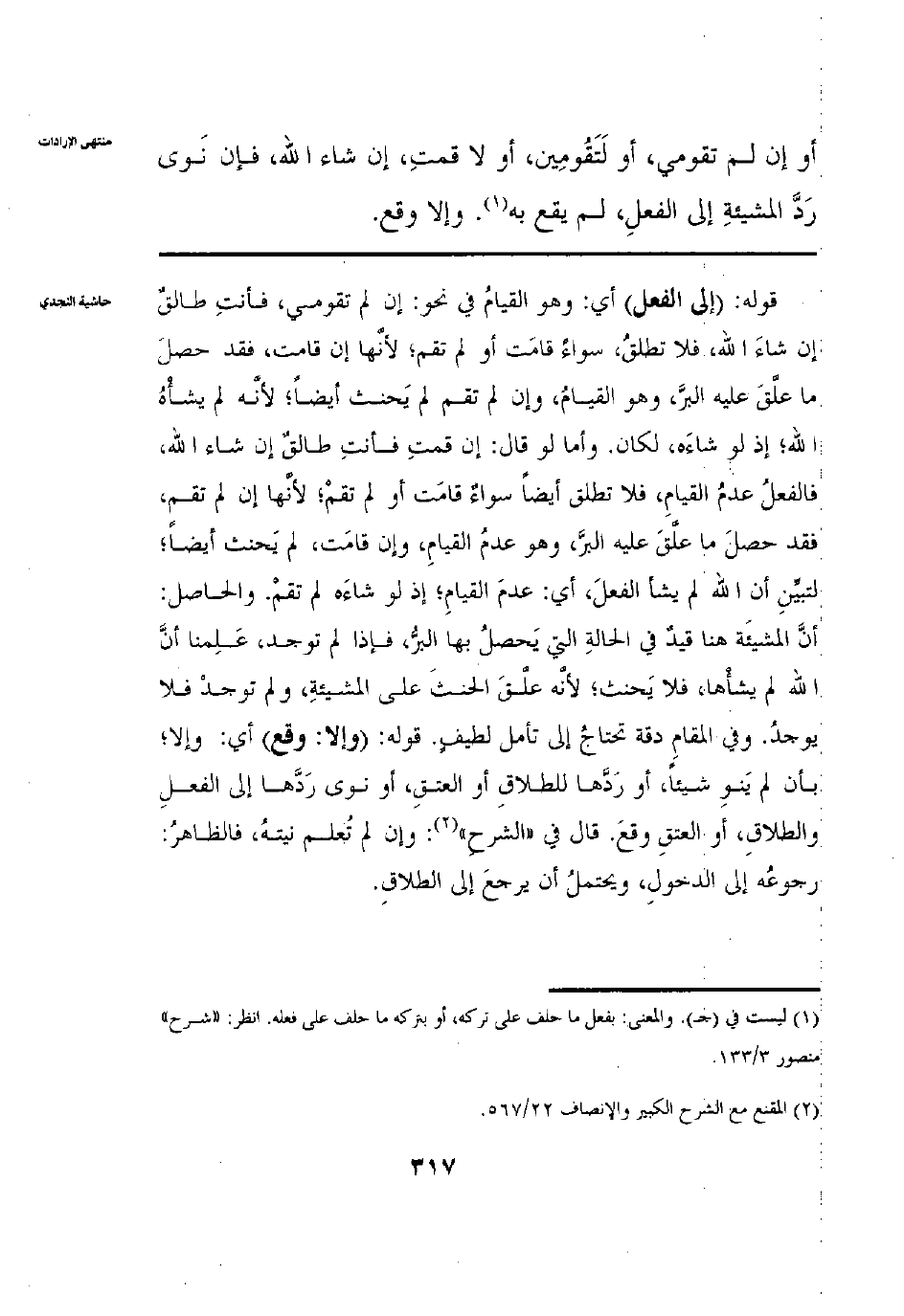 أَوْ إنْ لَمْ تَقُومِي أَوْ لَتَقُومِينَ أَوْ لَا قُمْت إنْ شَاءَ اللَّهُ فَإِنْ نَوَى رَدَّ الْمَشِيئَةِ إلَى الْفِعْلِ لَمْ يَقَعْ بِهِ وَإِلَّا وَقَعَ