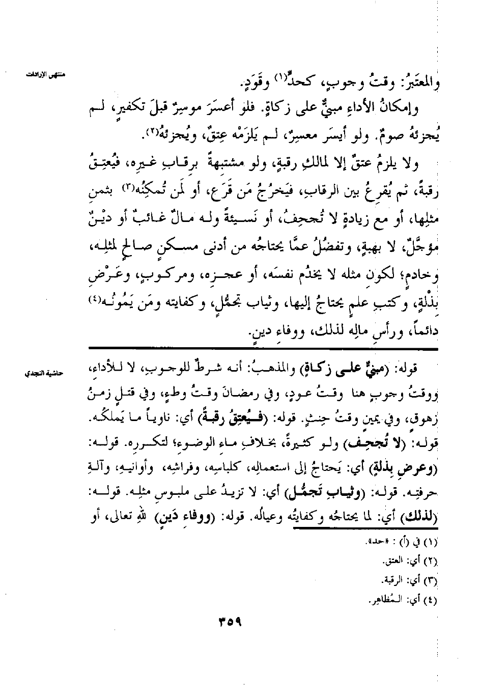 وَالْمُعْتَبَرُ وَقْتَ وُجُوبِ كَحَدٍّ وَقَوَدٍ وَإِمْكَانُ الْأَدَاءِ مَبْنِيٌّ عَلَى وَطْءٍ فَلَوْ أَعْسَرَ مُوسِرٌ قَبْلَ تَكْفِيرٍ لَمْ يُجْزِئْهُ صَوْمٌ وَلَوْ أَيْسَرَ مُعْسِرٌ لَمْ يَلْزَمْهُ عِتْقٌ وَيُجْزِيهِ وَلَا يَلْزَمُ عِتْقٌ إلَّا لِمَالِكِ رَقَبَةٍ وَلَوْ مُشْتَبِهَةً بِرِقَابِ غَيْرِهِ فَيُعْتِقُ رَقَبَةً ثُمَّ يُقْرِعُ بَيْنَ الرِّقَابِ فَيُخْرِجُ مَنْ قُرِعَ أَوْ لِمَنْ يُمْكِنُهُ بِثَمَنِ مِثْلِهَا أَوْ مَعَ زِيَادَةٍ لَا يُحْجَفُ أَوْ نَسِيئَةً وَلَهُ مَالٌ غَائِبٌ أَوْ دَيْنٌ مُؤَجَّلٌ لَا بِهِبَةٍ وتَفْضُلَ عَمَّا يَحْتَاجُهُ مِنْ أَدْنَى مَسْكَنٍ صَالِحٍ لِمِثْلِهِ وخَادِمٍ لِكَوْنِ مِثْلِهِ لَا يَخْدِمُ نَفْسَهُ أَوْ عَجْزِهِ وعَنْ مَرْكُوبٍ وَعَرَضٍ بَذَلَهُ وكُتُبِ عِلْمٍ يَحْتَاجُ إلَيْهَا وَثِيَابِ تَجَمُّلٍ وكِفَايَتِهِ ومَنْ يَمُونُهُ دَائِمًا وَوَفَاءِ دَيْنٍ