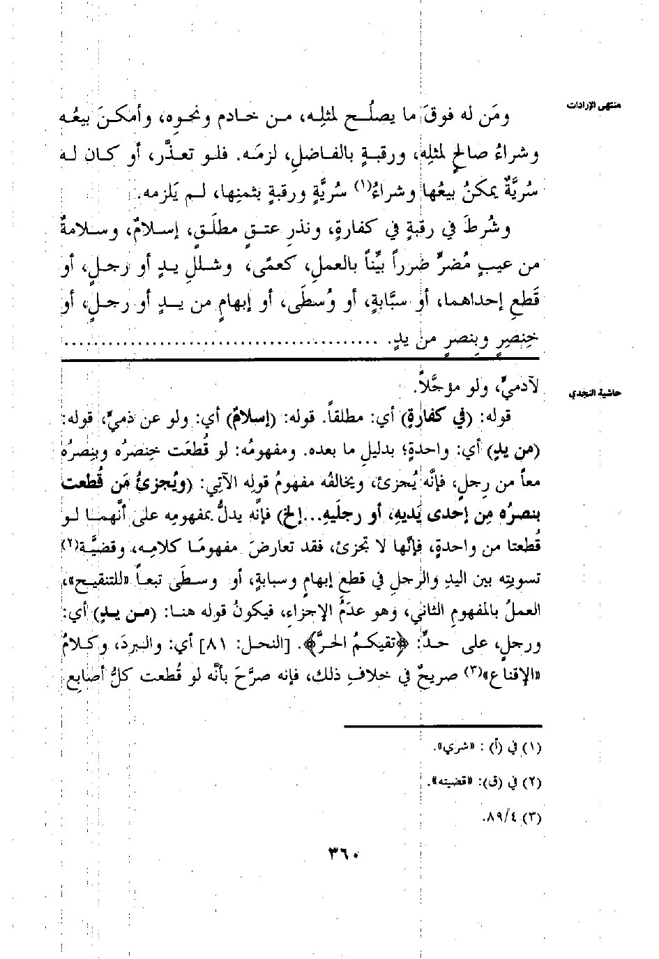 وَمَنْ لَهُ فَوْقَ مَا يَصْلُحُ لِمِثْلِهِ مِنْ خَادِمٍ وَنَحْوَهُ وَأَمْكَنَ بَيْعُهُ وَشِرَاءُ صَالِحٍ لِمِثْلِهِ ورَقَبَةٍ بِالْفَاضِلِ لَزِمَهُ فَلَوْ تَعَذَّرَ أَوْ كَانَ لَهُ سُرِّيَّةٌ يُمْكِنُ بَيْعُهَا وَشِرَاءُ سُرِّيَّةٍ وَرَقَبَةٍ بِثَمَنِهَا لَمْ يَلْزَمْهُ وَشُرِطَ رَقَبَةٍ فِي كَفَّارَةٍ مُطْلَقًا ونَذْرٍ عِتْقُ مُطْلَقٍ إسْلَامٌ وسَلَامَةٌ مِنْ عَيْبٍ مُضِرٍّ ضَرَرًا بَيِّنًا بِالْعَمَلِ كَعَمًى وشَلَلِ يَدٍ أَوْ رِجْلٍ أَوْ قَطْعِ إحْدَاهُمَا أَوْ سَبَّابَةٍ أَوْ وُسْطَى أَوْ إبْهَامٍ مِنْ يَدٍ أَوْ رِجْلٍ أَوْ خِنْصَرٍ وَبِنْصَرٍ مِنْ يَدٍ