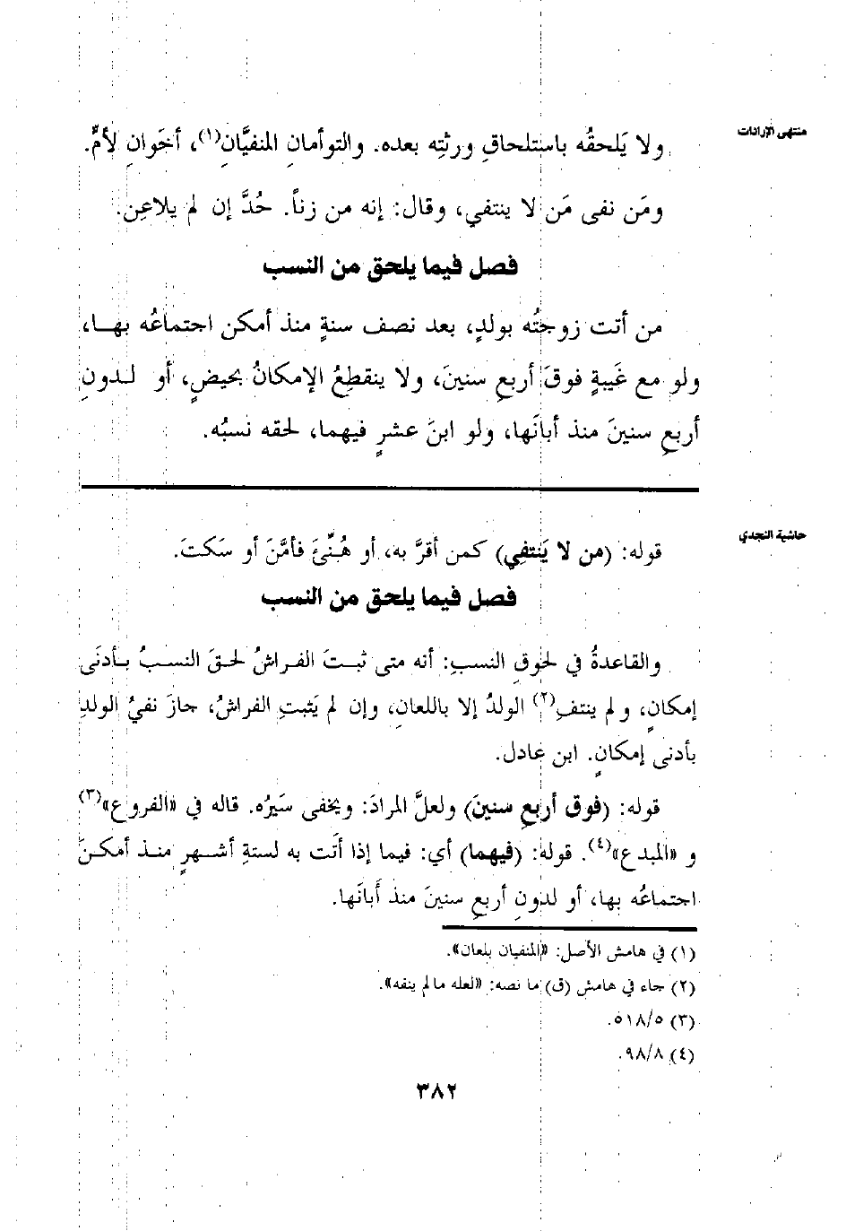 مَنْ أَتَتْ زَوْجَتُهُ بِوَلَدٍ بَعْدَ نِصْفِ سَنَةٍ مُنْذُ أَمْكَنَ اجْتِمَاعُهُ بِهَا وَلَوْ مَعَ غَيْبَةٍ فَوْقَ أَرْبَعِ سِنِينَ وَلَا يَنْقَطِعُ الْإِمْكَانُ بِحَيْضٍ أَوْ لِدُونِ أَرْبَعِ سِنِينَ مُنْذُ أَبَانَهَا وَلَوْ ابْنَ عَشْرِ فِيهِمَا لَحِقَهُ نَسَبُهُ