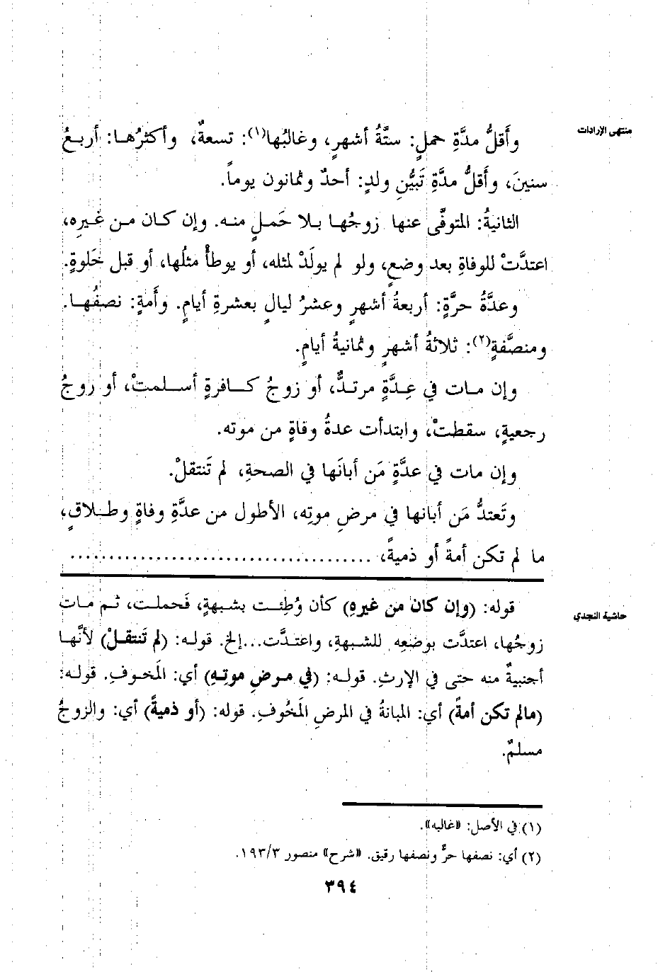 وَأَقَلُّ مُدَّةِ حَمْلٍ سِتَّةَ أَشْهُرٍ وَغَالِبُهَا تِسْعَةُ وَأَكْثَرُهَا أَرْبَعُ سِنِينَ وَأَقَلُّ مُدَّةِ تَبَيُّنِ خَلْقِ وَلَدٍ أَحَدٌ وَثَمَانُونَ يَوْمًا الثَّانِيَة الْمُتَوَفَّى عَنْهَا زَوْجُهَا بِلَا حَمْلٍ مِنْهُ وَإِنْ كَانَ مِنْ غَيْرِهِ اعْتَدَّتْ لِلْوَفَاةِ بَعْدَ وَضْعِ وَلَوْ لَمْ يُولَدْ لِمِثْلِهِ أَوْ لَمْ يُوطَأْ مِثْلُهَا أَوْ قَبْلَ خَلْوَةٍ وَعِدَّةُ حُرَّةٍ أَرْبَعَةُ أَشْهُرٍ وَعَشْرُ لَيَالٍ بِعَشَرَةِ أَيَّامٍ وأَمَةٍ نِصْفُهَا ومُنَصَّفَةٍ ثَلَاثَةُ أَشْهُرٍ وَثَمَانِيَةُ أَيَّامٍ وَإِنْ مَاتَ فِي عِدَّةٍ مُرْتَدٌّ أَوْ زَوْجُ كَافِرَةٍ أَسْلَمَتْ أَوْ زَوْجُ رَجْعِيَّةٍ سَقَطَتْ وَابْتَدَأَتْ عِدَّةَ وَفَاةٍ مِنْ مَوْتِهِ وَإِنْ مَاتَ فِي عِدَّةٍ مَنْ أَبَانَهَا فِي الصِّحَّةِ لَمْ تَنْتَقِلْ وَتَعْتَدُّ مَنْ أَبَانَهَا فِي مَرَضِ مَوْتِهِ الْأَطْوَلِ مِنْ عِدَّةِ وَفَاةٍ وَمِنْ عِدَّةِ طَلَاقٍ مَا لَمْ تَكُنْ أَمَةً أَوْ ذِمِّيَّةً