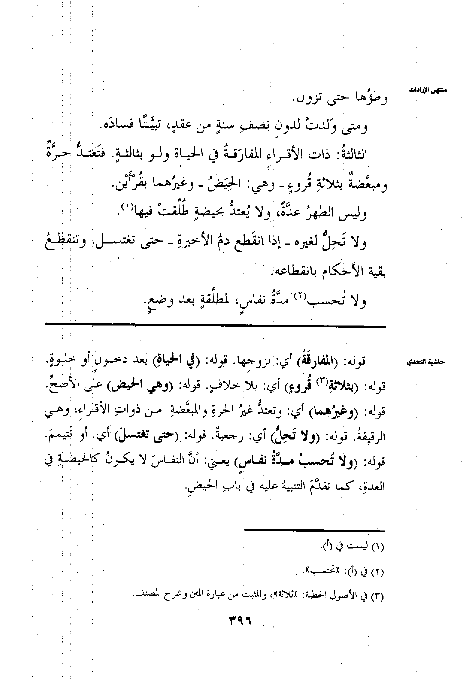 وَطْؤُهَا حَتَّى تَزُولَ وَمَتَى وَلَدَتْ لِدُونِ نِصْفِ سَنَةٍ مِنْ عَقْدٍ تَبَيَّنَّا فَسَادَهُ الثَّالِثَةُ ذَاتُ الْأَقْرَاءِ الْمُفَارَقَةِ فِي الْحَيَاةِ وَلَوْ بِطَلْقَةٍ ثَالِثَةٍ فَتَعْتَدُّ حُرَّةٌ وَمُبَعَّضَةٌ بِثَلَاثَةِ قُرُوءٍ وَهِيَ الْحَيْضُ وغَيْرُهُمَا بِقُرْأَيْنِ لَيْسَ الطُّهْرُ عِدَّةً وَلَا تَعْتَدُّ بِحَيْضَةٍ طَلُقَتْ فِيهَا وَلَا تَحِلُّ لِغَيْرِهِ إذَا انْقَطَعَ دَمُ الْأَخِيرَةِ حَتَّى تَغْتَسِلَ أَوْ تَتَيَمَّمَ عِنْدَ التَّعَذُّرِ فِي قَوْلِ أَكَابِرِ وَتَنْقَطِعُ بَقِيَّةُ الْأَحْكَامِ بِانْقِطَاعِهِ وَلَا تُحْسَبُ مُدَّةُ نِفَاسٍ لِمُطَلَّقَةٍ بَعْدَ وَضْعٍ
