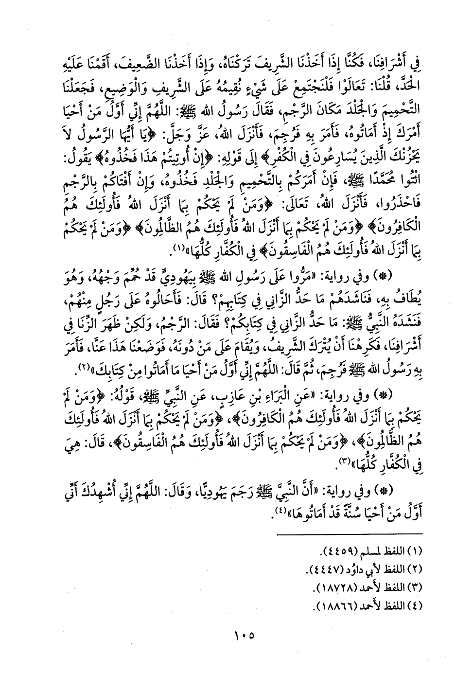 - وفي رواية: «مروا على رسول الله صَلى الله عَليه وسَلم بيهودي قد حمم وجهه، وهو يطاف به، فناشدهم ما حد الزاني في كتابهم؟ قال: فأحالوه على رجل منهم، فنشده النبي صَلى الله عَليه وسَلم: ما حد الزاني في كتابكم؟ فقال: الرجم، ولكن ظهر الزنا في أشرافنا، فكرهنا أن يترك الشريف، ويقام على من دونه، فوضعنا هذا عنا، فأمر به رسول الله صَلى الله عَليه وسَلم فرجم، ثم قال: اللهم إني أول من أحيا ما أماتوا من كتابك» (¬١).