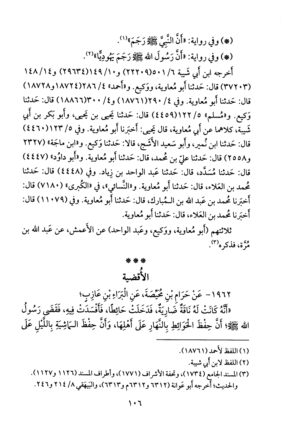 «أنه كانت له ناقة ضارية، فدخلت حائطا، فأفسدت فيه، فقضى رسول الله صَلى الله عَليه وسَلم؛ أن حفظ الحوائط بالنهار على أهلها، وأن حفظ الماشية بالليل على