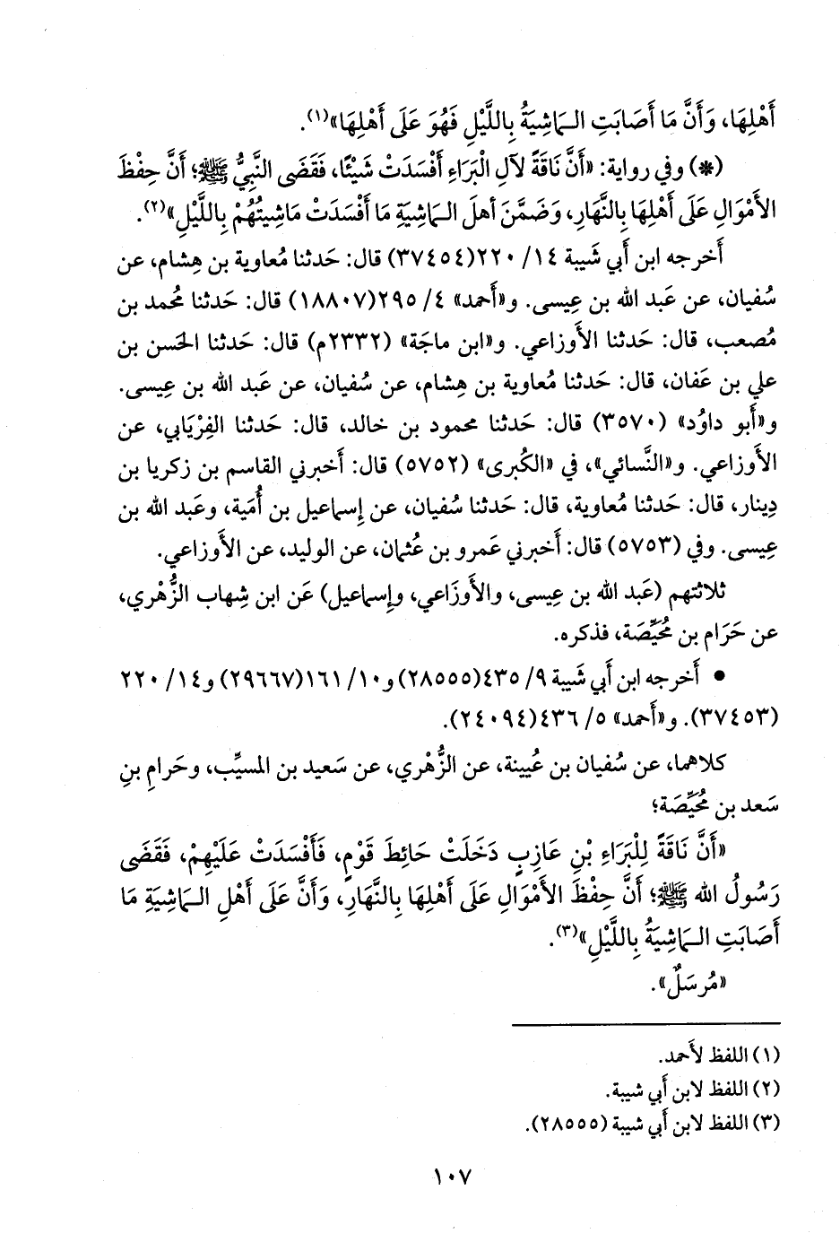 «أن ناقة له وقعت في حائط قوم، فقضى فيه رسول الله صَلى الله عَليه وسَلم؛ على أهل الأموال الحفظ بالنهار، وعلى أهل المواشي الحفظ بالليل، وهو النفش الذي ذكر الله، عز وجل، في القرآن».
