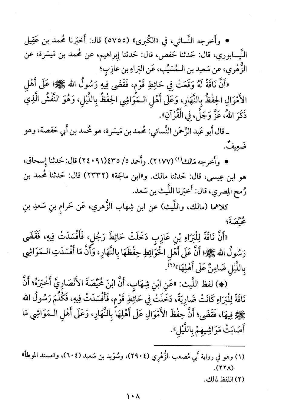 - لفظ الليث: «عن ابن شهاب، أن ابن مُحَيِّصَة الأَنصاري أخبره؛ أن ناقة للبراء كانت ضارية، دخلت في حائط قوم، فأفسدت فيه، فكلم رسول الله صَلى الله عَليه وسَلم فيها، فقضى؛ أن حفظ الأموال على أهلها بالنهار، وعلى أهل المواشي ما أصابت مواشيهم بالليل».