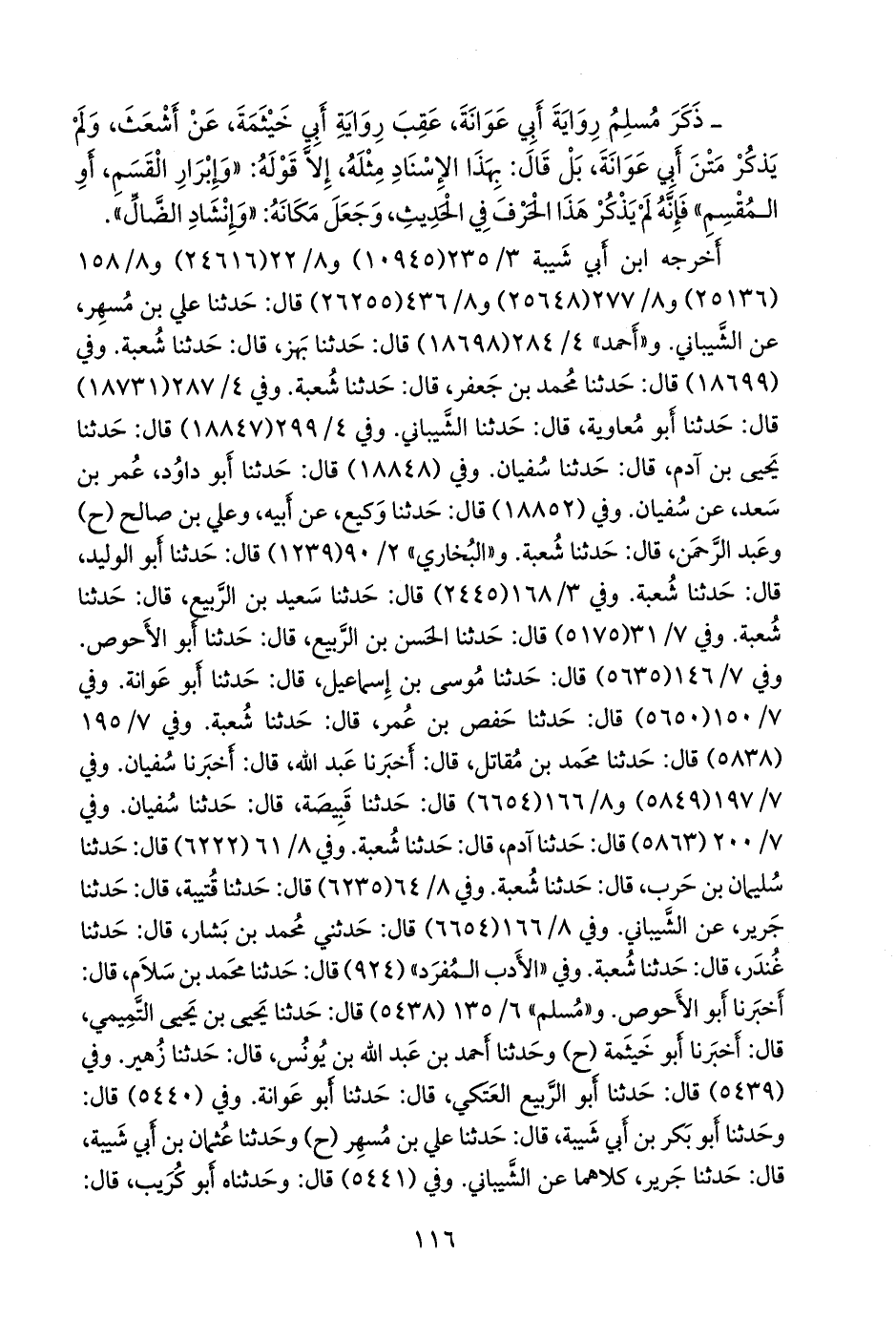 حدثنا ابن إدريس، قال: أخبرنا أَبو إسحاق الشيباني، وليث بن أبي سُلَيم (ح) وحدثنا محمد بن المثنى، وابن بشار، قالا: حدثنا محمد بن جعفر (ح) وحدثنا عُبيد الله بن معاذ، قال: حدثنا أبي (ح) وحدثنا إسحاق بن إبراهيم، قال: أخبرنا أَبو عامر العَقَدي (ح) وحدثنا عبد الرَّحمَن بن بشر، قال: حدثني بَهز، قالوا جميعا: حدثنا شعبة.