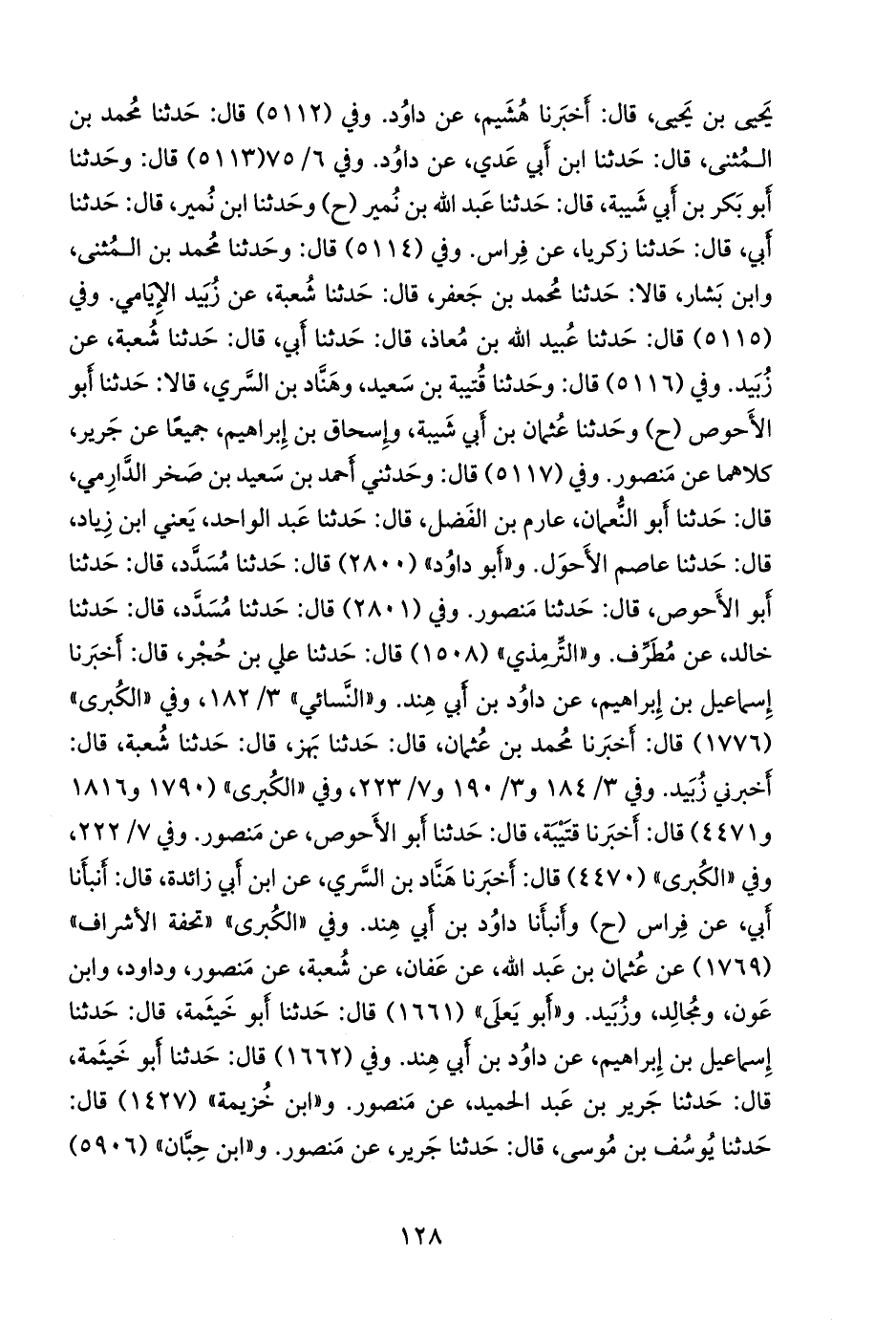 وفي (٥١١٥) قال: حدثنا عُبيد الله بن معاذ، قال: حدثنا أبي، قال: حدثنا شعبة، عن زبيد. وفي (٥١١٦) قال: وحدثنا قتيبة بن سعيد، وهناد بن السَّري، قالا: حدثنا أَبو الأحوص (ح) وحدثنا عثمان بن أبي شيبة، وإسحاق بن إبراهيم، جميعا عن جرير، كلاهما عن منصور. وفي (٥١١٧) قال: وحدثني أحمد بن سعيد بن صخر الدَّارِمي، قال: حدثنا أَبو النعمان، عارم بن الفضل، قال: حدثنا عبد الواحد، يعني ابن زياد، قال: حدثنا عاصم الأحول. و «أَبو داود» (٢٨٠٠) قال: حدثنا مُسدد، قال: حدثنا أَبو الأحوص، قال: حدثنا منصور. وفي (٢٨٠١) قال: حدثنا مُسدد، قال: حدثنا خالد، عن مطرف. و «التِّرمِذي» (١٥٠٨) قال: حدثنا علي بن حُجْر، قال: أخبرنا إسماعيل بن إبراهيم، عن داود بن أبي هند. و «النَّسَائي» ٣/ ١٨٢، وفي «الكبرى» (١٧٧٦) قال: أخبرنا محمد بن عثمان، قال: حدثنا بَهز، قال: حدثنا شعبة، قال: أخبرني زبيد. وفي ٣/ ١٨٤ و ٣/ ١٩٠ و ٧/ ٢٢٣، وفي «الكبرى» (١٧٩٠ و ١٨١٦ و ٤٤٧١) قال: أخبرنا قتيبة، قال: حدثنا أَبو الأحوص، عن منصور. وفي ٧/ ٢٢٢، وفي «الكبرى» (٤٤٧٠) قال: أخبرنا هَنَّاد بن السَّري، عن ابن أبي زائدة، قال: أنبأنا أبي، عن فراس (ح) وأنبأنا داود بن أبي هند. وفي «الكبرى» «تحفة الأشراف» (١٧٦٩) عن عثمان بن عبد الله، عن عفان، عن شعبة، عن منصور، وداود، وابن عون، ومجالد، وزبيد. و «أَبو يَعلى» (١٦٦١) قال: حدثنا أَبو خيثمة، قال: حدثنا إسماعيل بن إبراهيم، عن داود بن أبي هند. وفي (١٦٦٢) قال: حدثنا أَبو خيثمة، قال: حدثنا جَرير بن عبد الحميد، عن منصور. و «ابن خزيمة» (١٤٢٧) قال: حدثنا يوسف بن موسى، قال: حدثنا جرير، عن منصور. و «ابن حِبَّان» (٥٩٠٦)