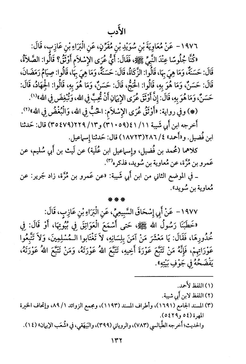 «كنا جلوسا عند النبي صَلى الله عَليه وسَلم فقال: أي عرى الإسلام أوثق؟ قالوا: الصلاة، قال: حسنة، وما هي بها، قالوا: الزكاة، قال: حسنة، وما هي بها، قالوا: صيام رمضان، قال: حسن، وما هو به، قالوا: الحج، قال: حسن، وما هو به، قالوا: الجهاد، قال: حسن، وما هو به، قال: إن أوثق عرى الإيمان أن تحب في الله، وتبغض في الله».
