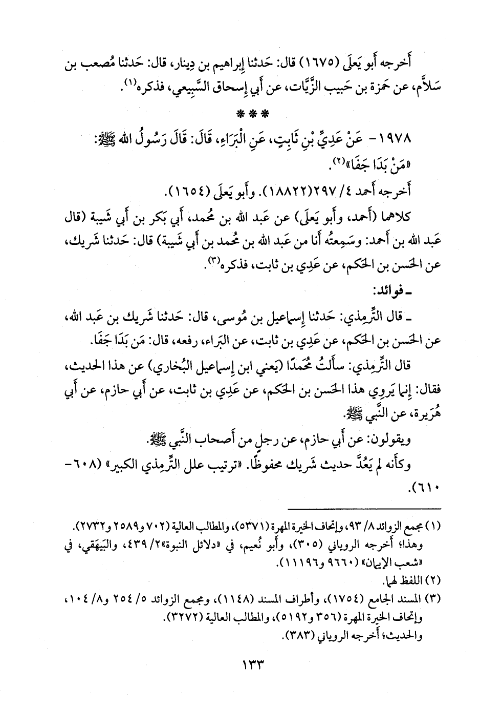 - قلنا: إِسناده ضعيفٌ؛ قال التِّرمِذي: حدثنا إِسماعيل بن موسى، قال: حدثنا شَريك بن عبد الله، عن الحسن بن الحَكم، عن عَدي بن ثابت، عن البراء، رفعه، قال: من بَدا جَفا.