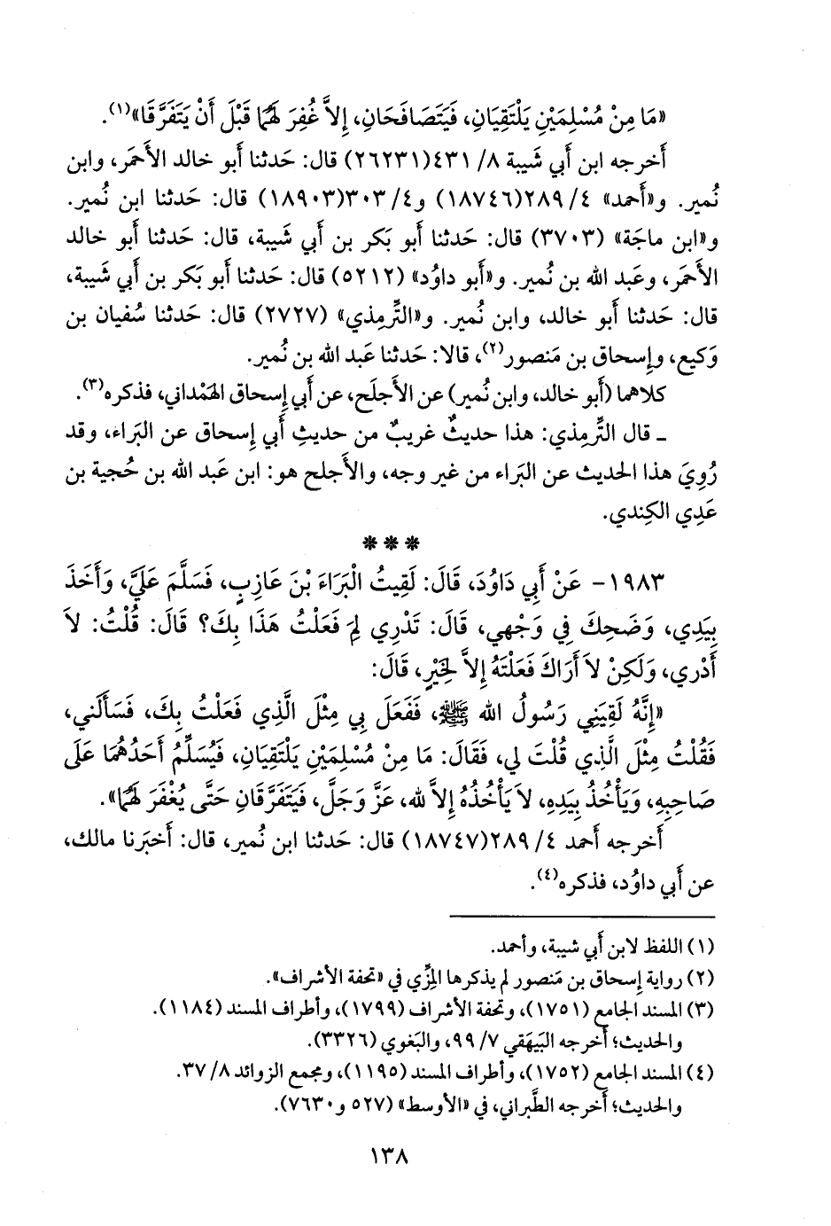 ١٩٨٣ - عن أبي داود، قال: لقيت البراء بن عازب، فسلم علي، وأخذ بيدي، وضحك في وجهي، قال: تدري لم فعلت هذا بك؟ قال: قلت: لا أدري، ولكن لا أراك فعلته إلا لخير، قال: