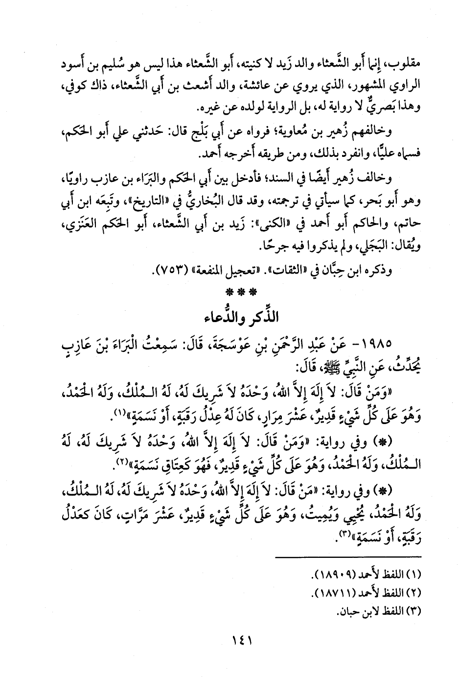 ١٩٨٥ - عن عبد الرَّحمَن بن عوسجة، قال: سمعت البراء بن عازب يحدث، عن النبي صَلى الله عَليه وسَلم قال: