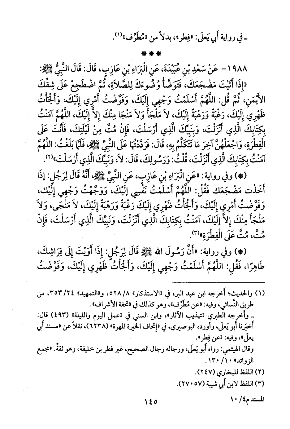 - وفي رواية: «عن البراء بن عازب، عن النبي صَلى الله عَليه وسَلم أنه قال لرجل: إذا أخذت مضجعك فقل: اللهم أسلمت نفسي إليك، ووجهت وجهي إليك، وفوضت أمري إليك، وألجأت ظهري إليك رغبة ورهبة إليك، لا منجى، ولا ملجأ منك إلا إليك، آمنت بكتابك الذي أنزلت، ونبيك الذي أرسلت، فإن مت، مت على الفطرة» (¬٢).